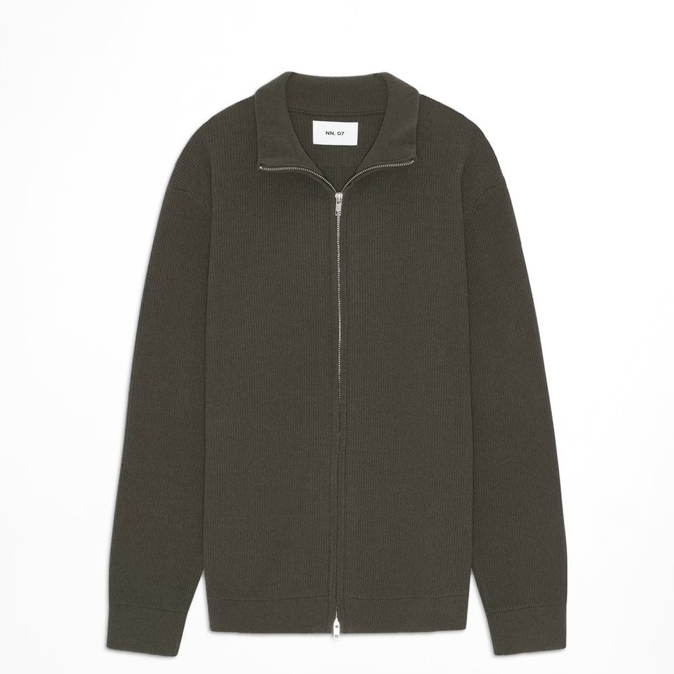 The NN07 Danny Full Zip Knit in Dark Army is a classic full-zip sweater made from ultra-soft polyester rib knit for comfort and durability. It features a relaxed fit suitable for casual or layered outfits.