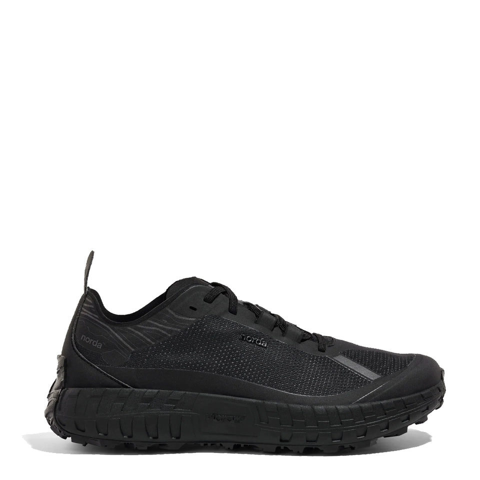 with Bio-Dyneema, the world's lightest and strongest material. This all-black Norda upper is paired with innovative components found 001 trail shoes, such as the exclusively designed Norda x Vibram ultimate high-performance trail running sole.