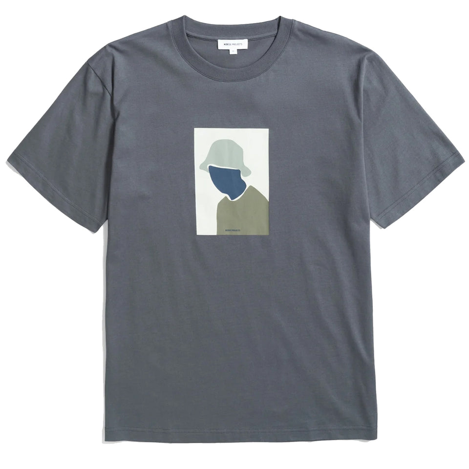 The Norse Projects Johannes Organic Bucket Hat Print T-shirt in Magnet Grey - a regular fitting t-shirt cut from an organic midweight cotton jersey. It features a screen printed artwork on the chest, ribbed collar and finished with twin needle stitched hem and cuffs.