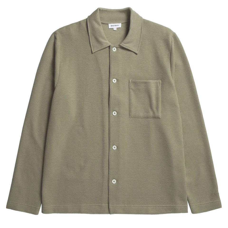 The Norse Projects Jorn Double Face Overshirt in Clay is expertly crafted from a double face jersey with a knitted rib structure, offering a unique texture and warmth. This overshirt features a knitted collar, a button-through placket, and twin needle-stitched hems and cuffs for added durability. A chest pocket adds functionality, while logo embroidery on the sleeve provides a subtle touch of branding. This versatile piece is perfect for layering and adds a stylish touch to any outfit.