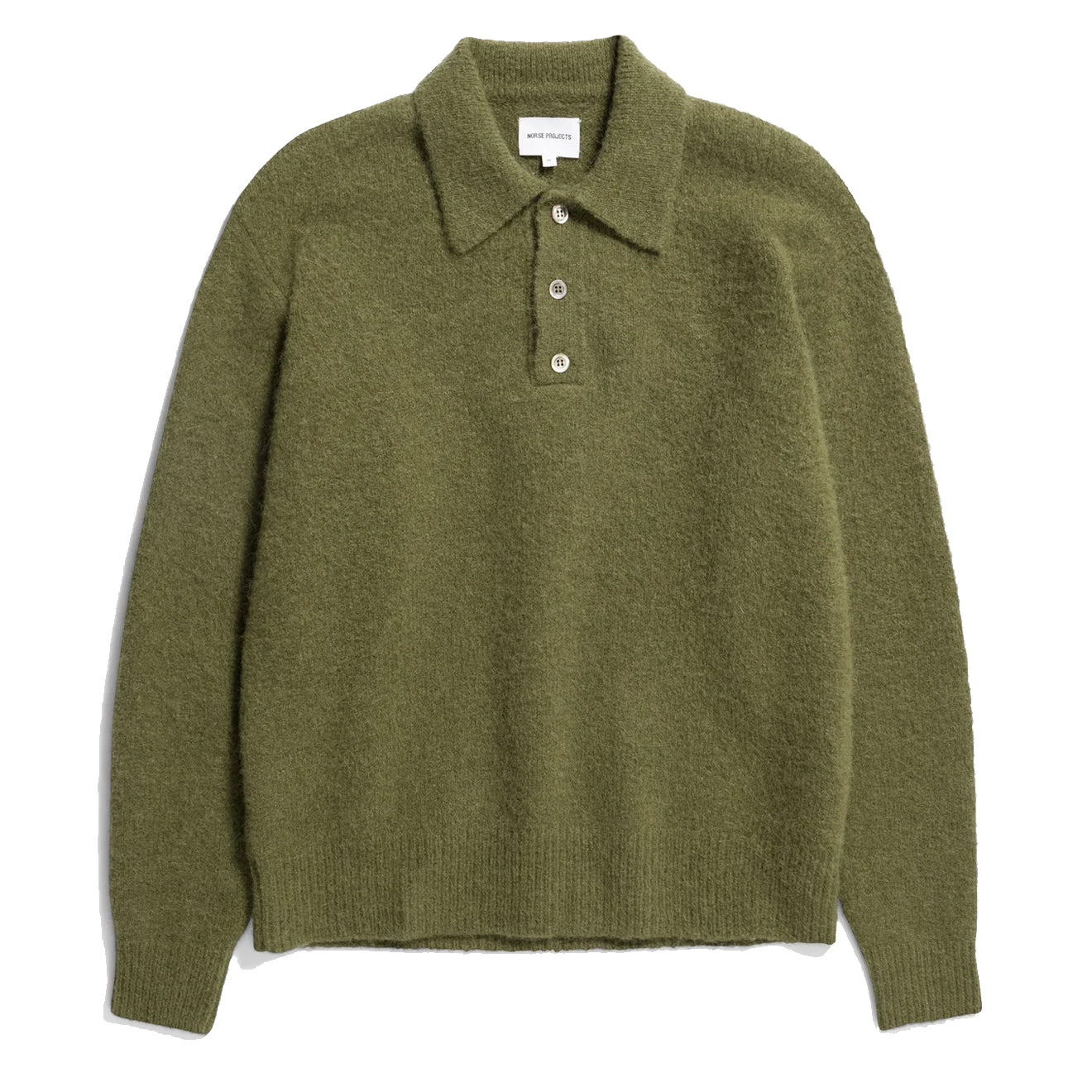 Norse Projects Rasmus Relaxed Brushed Polo is a relaxed-fit polo knitted from an alpaca/wool blend with set-in sleeves, a two-button placket, and ribbed cuffs and hem.