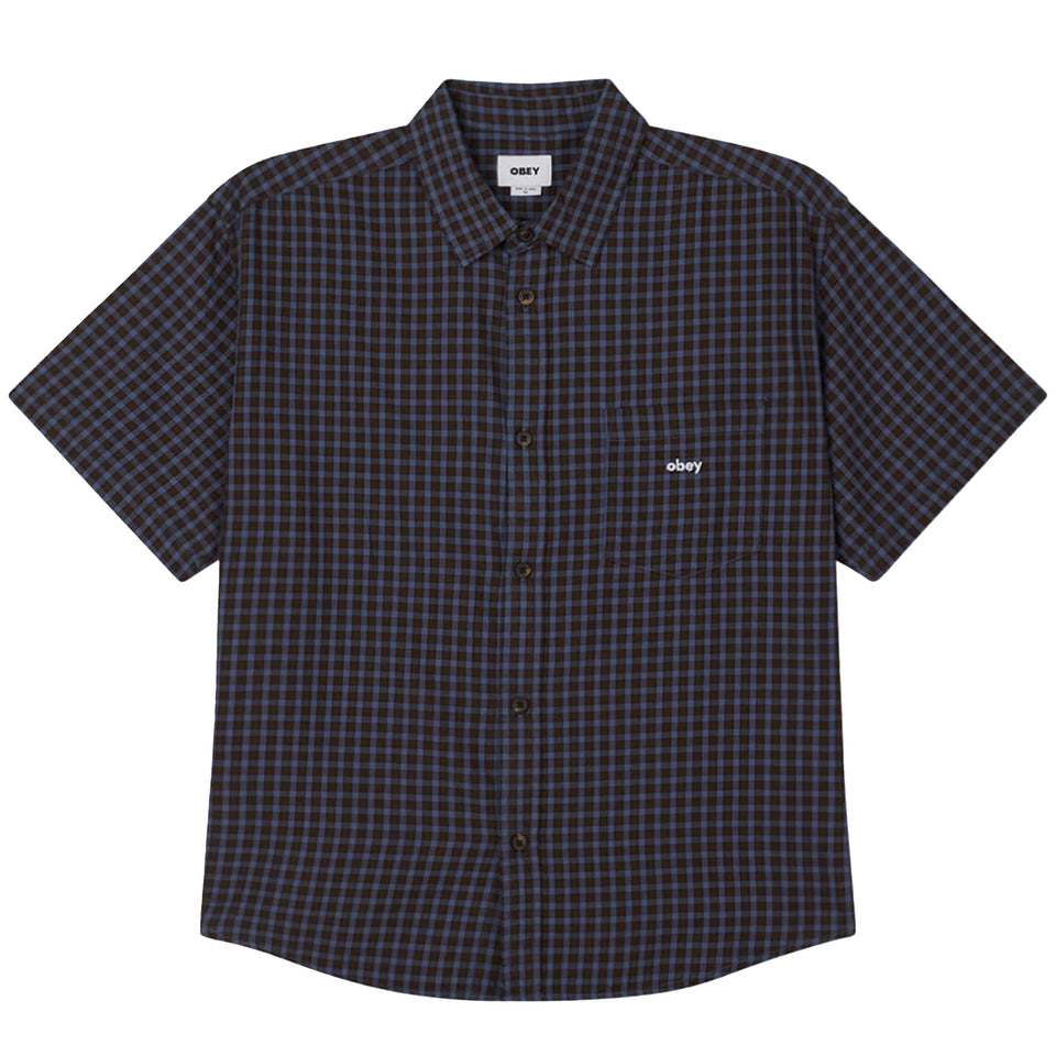 The Obey Bigwig Otis Woven Shirt in Dull Blue Multi is a brushed flannel short-sleeve shirt featuring a button-front closure, a single chest pocket, and a scallop hem. With an embroidered logo on the pocket, this shirt is made from 100% cotton and is Fair Trade certified. Designed with a loose fit, it's perfect for casual, comfortable wear.