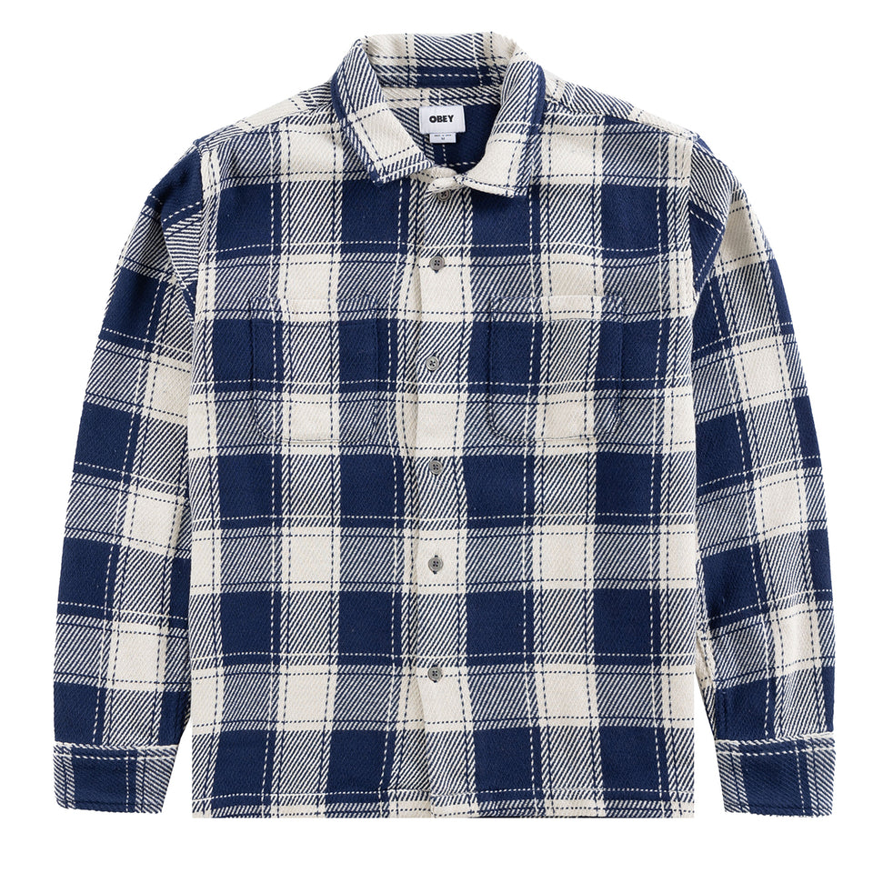 The Obey Echos Woven Shirt in Academy Navy Multi is a versatile and stylish piece designed with a relaxed fit for all-day comfort. Made from 100% Fair Trade cotton, it features a full button-front closure, double chest pockets, and adjustable double-button cuffs for practicality and ease. The straight bottom hem adds a clean finish, while the Obey side seam flag label provides a subtle branded touch.