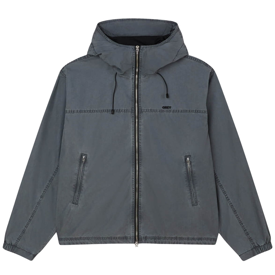 The Obey Highland Jacket in Pigment Anthracite is a cropped technical jacket that combines style with functionality. It features a two-way zip closure, metal zip pockets, and elasticated cuffs for a secure fit. The three-piece hood provides extra protection, while the Obey logo embroidery adds a signature touch. Made from a durable cotton and nylon blend with denim, this relaxed-fit jacket is perfect for layering in cooler weather.