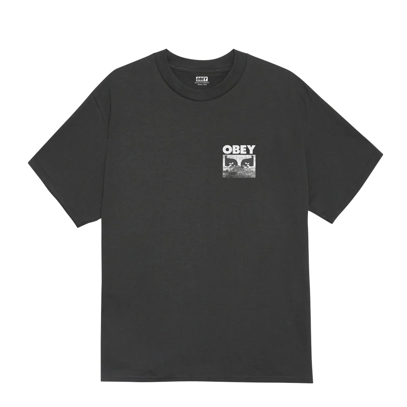 The Obey In A Different Place S/S Tee in Vintage Black is a midweight short sleeve t-shirt featuring bold printed artwork on the front and back. Made from 6 oz. 100% cotton, it offers a comfortable regular fit with a soft feel and washed finish for a vintage aesthetic.