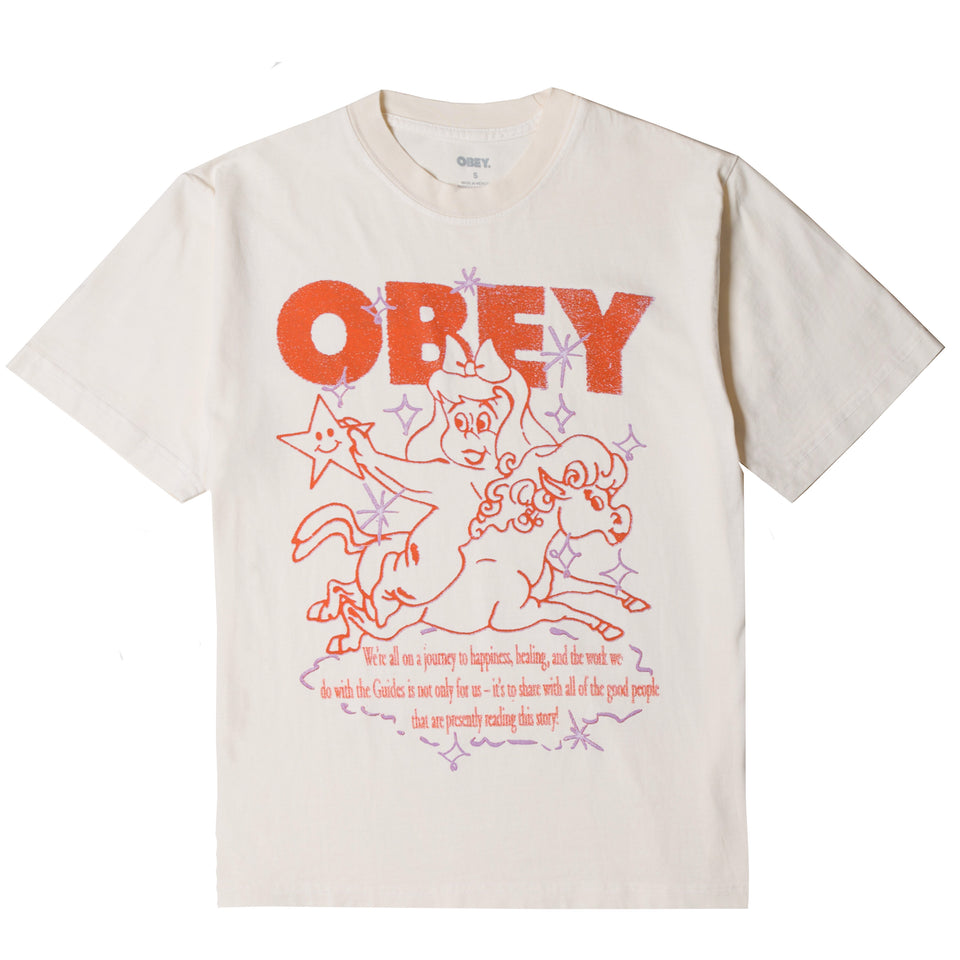 The Obey Women's Spirit Guide Pigment T-Shirt in Unbleached is crafted from 100% cotton with a box fit design for a relaxed and comfortable silhouette. The t-shirt features a custom Maxine pigment dye process, giving it a unique, vintage-inspired look. Perfect for casual wear, this soft, breathable t-shirt combines a classic fit with a distinct, washed-out finish that makes it a versatile addition to your wardrobe.