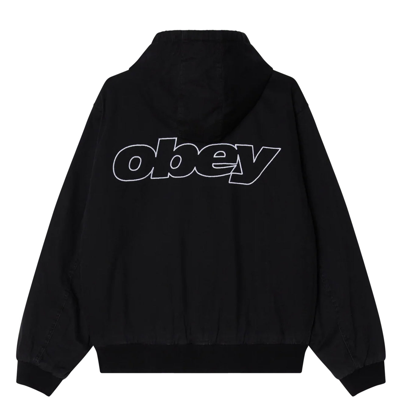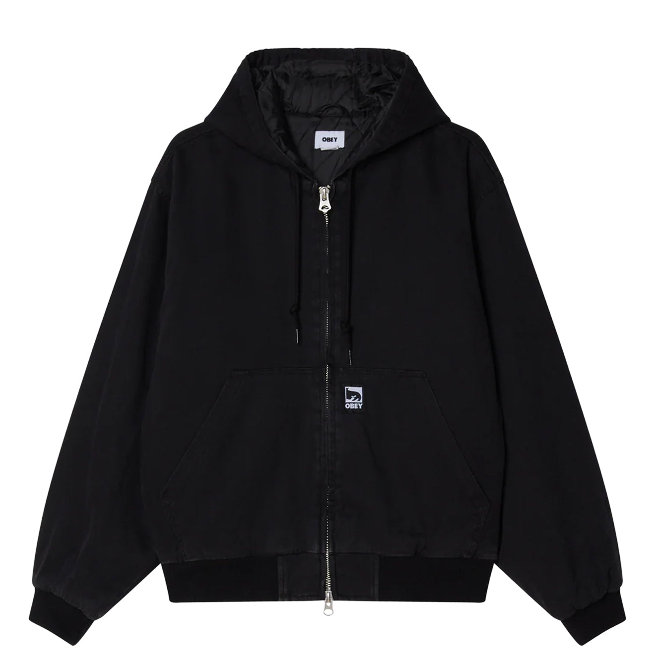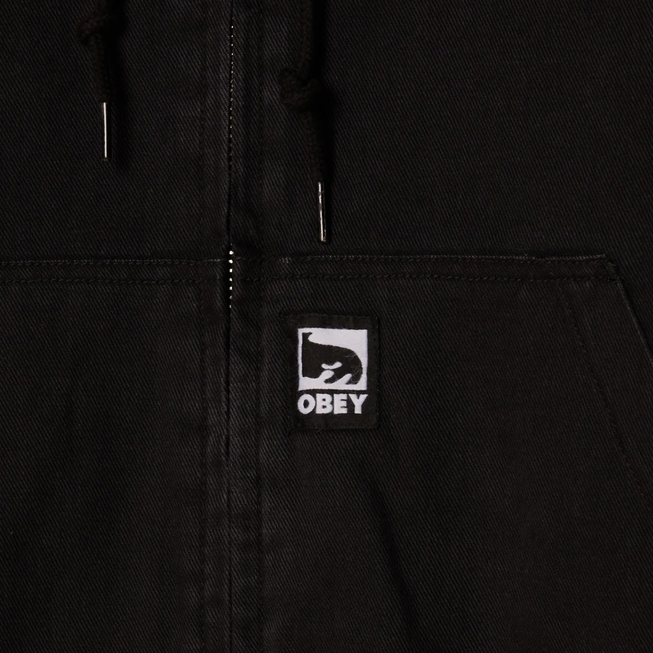The Obey Randy Zip Up Hood in Black Faded Wash is a relaxed-fit zip-up jacket built with a faded twill outer and soft insulation. Featuring a two-way metal zip, three-piece hood with round drawcord, and ribbed cuffs and hem, it blends functional construction with Obey’s signature graphic style. A printed artwork on the back and an Obey art label add subtle branding to this fully lined workwear-inspired piece.