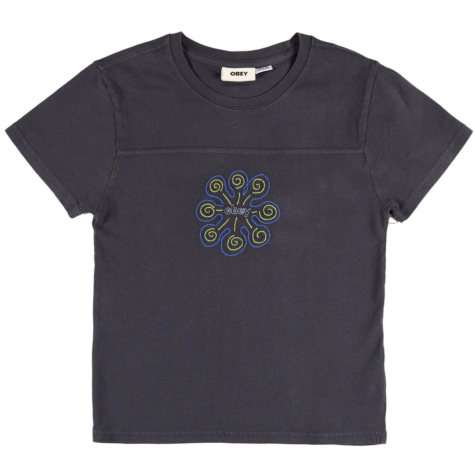 The Obey Women's Relax Tee Short Sleeve in Digital Black is a fitted t-shirt made from soft, pigment-dyed cotton for a lived-in feel. It features a ribbed neckband, chest seam, and Obey embroidery at the chest for subtle detail. Fair Trade certified, this tee offers both comfort and conscious style for everyday wear.