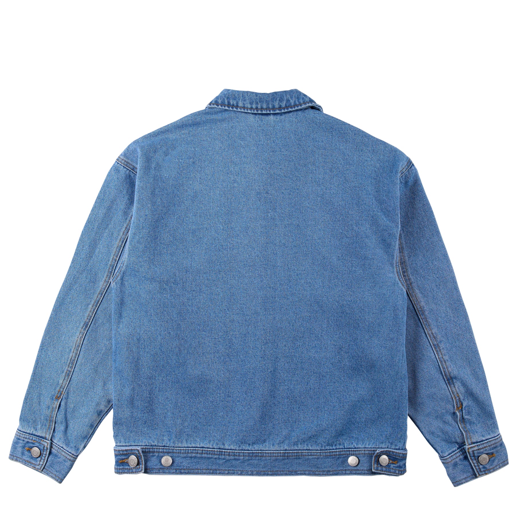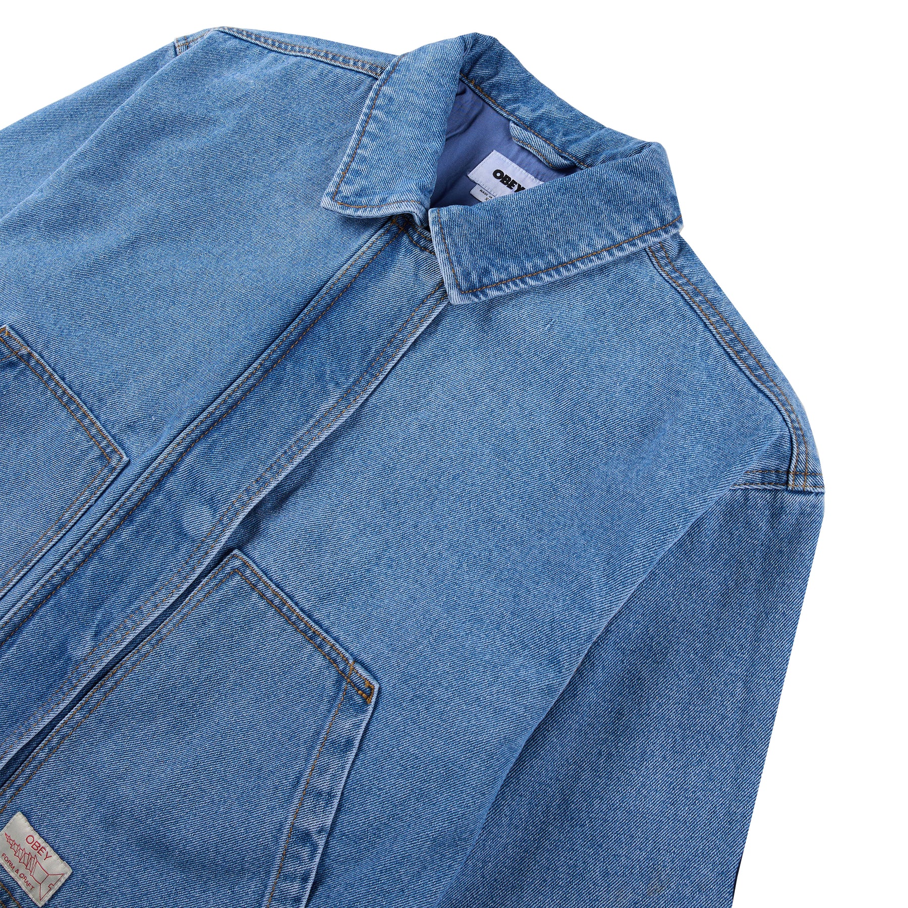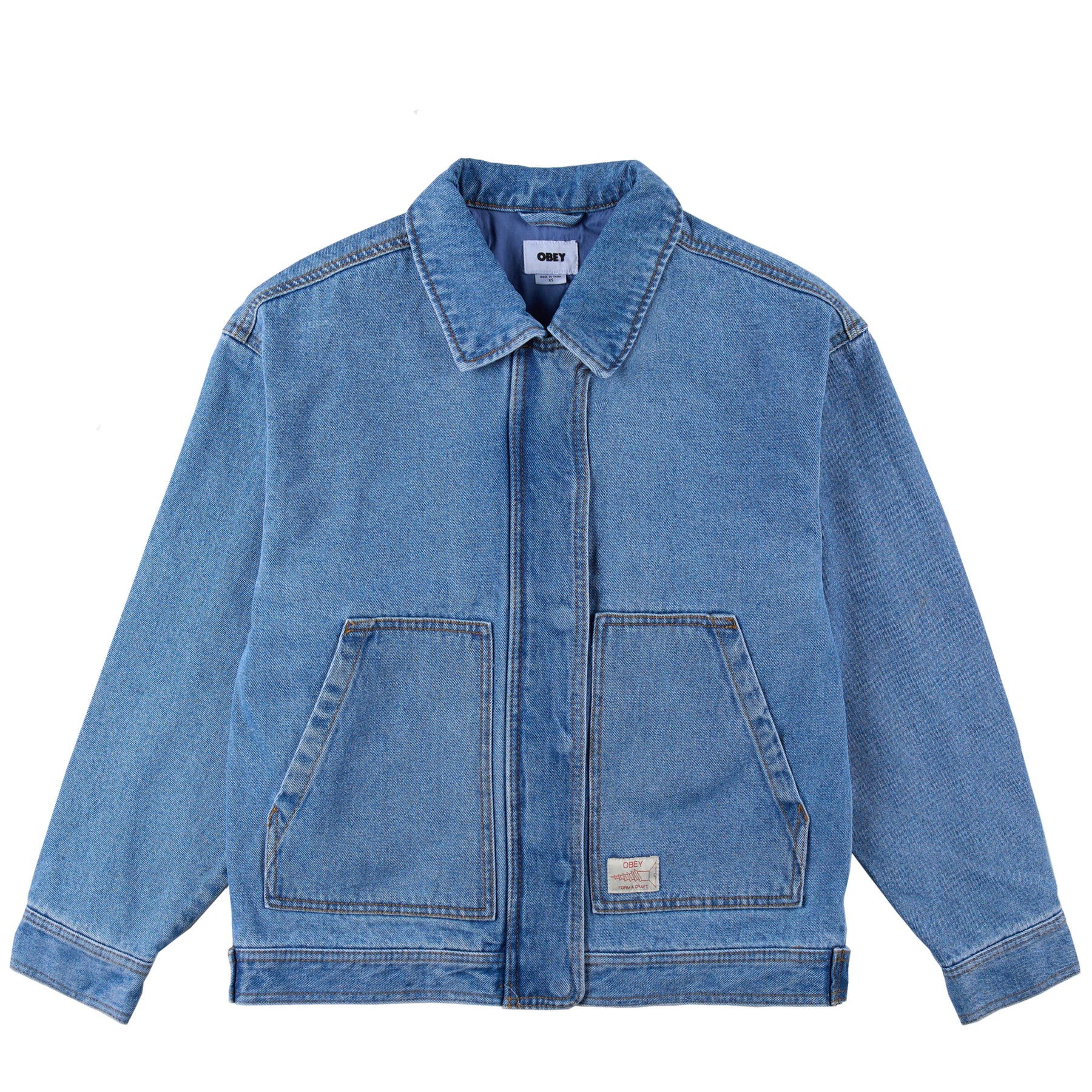 The Obey Women's Sybil Jacket in Light Indigo is a relaxed-fit denim work jacket that blends style and function. Crafted from cotton, it features a contrast self collar, hidden snap and zipper closure, and adjustable cuffs for a customizable fit. The back waist includes an adjustable tab closure for added shape, while patch front pockets with logo labels offer utility and signature detailing. Ideal for layering, this jacket is perfect for everyday casual wear.