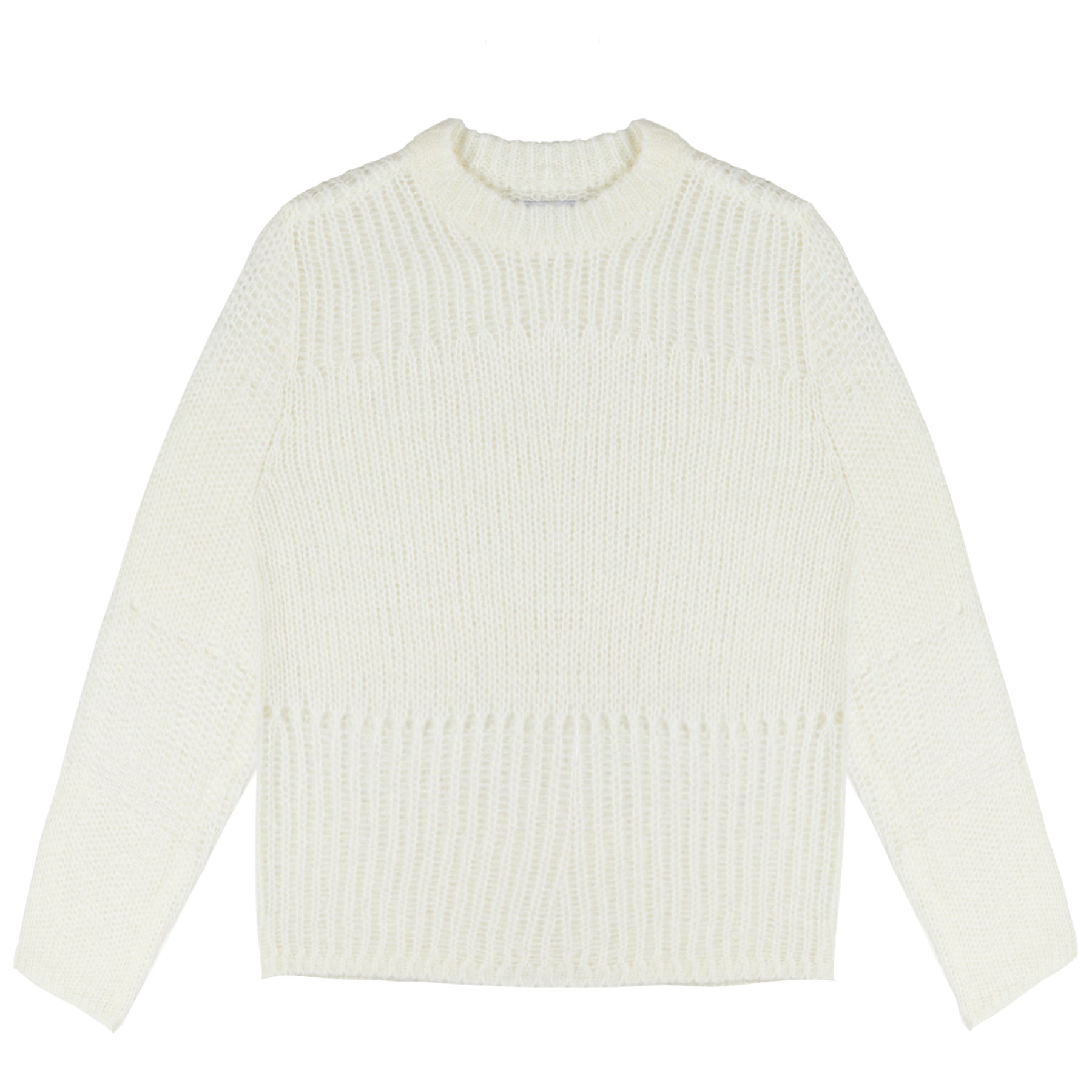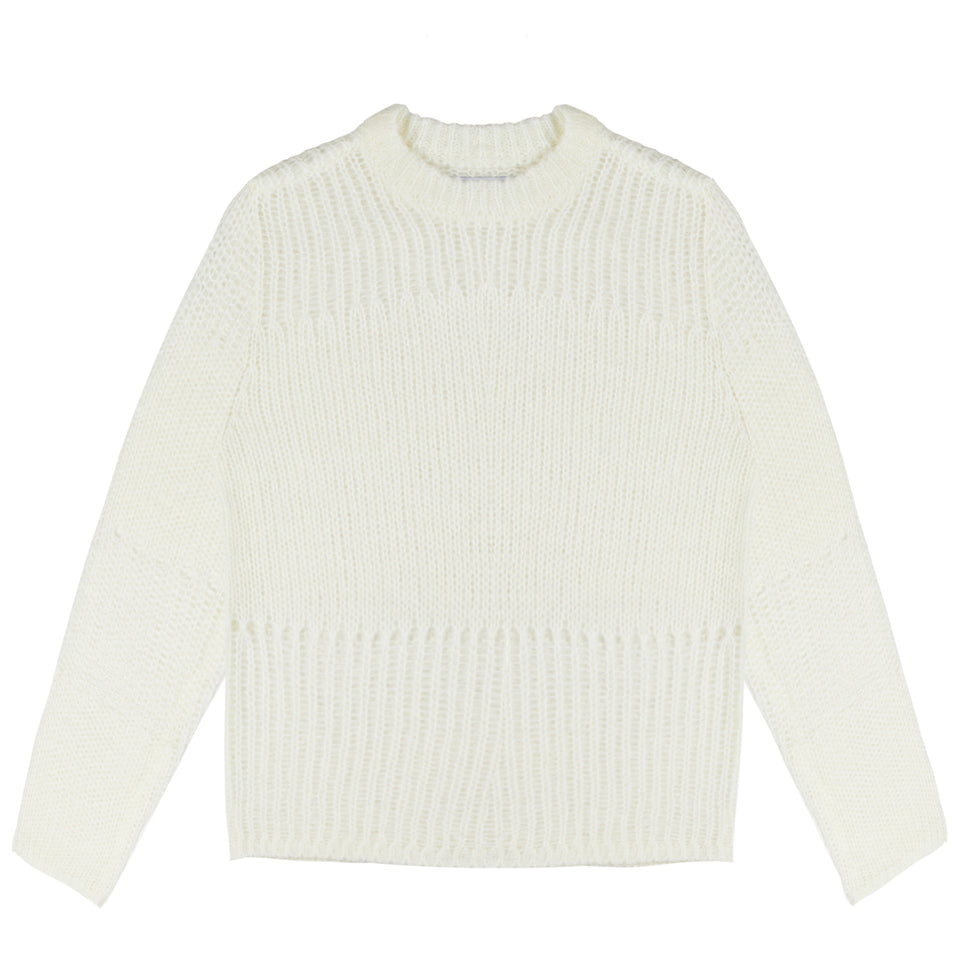 The Obey Women's Trivia Open Knit Sweater in Cream features a relaxed fit and a mixed knit technique for added texture. Made from 100% acrylic, it includes a ribbed neckband, waist, and cuffs for a snug feel. The Obey logo label at the side seam adds a touch of signature style. Perfect for layering or casual wear, this sweater offers comfort and a modern look.