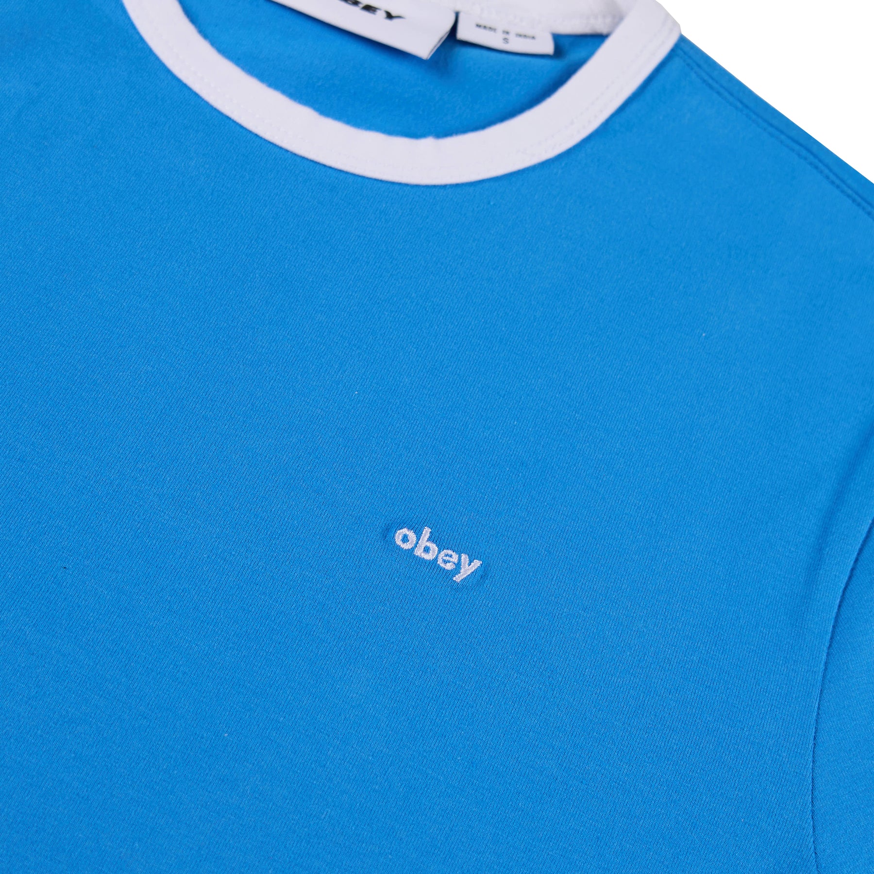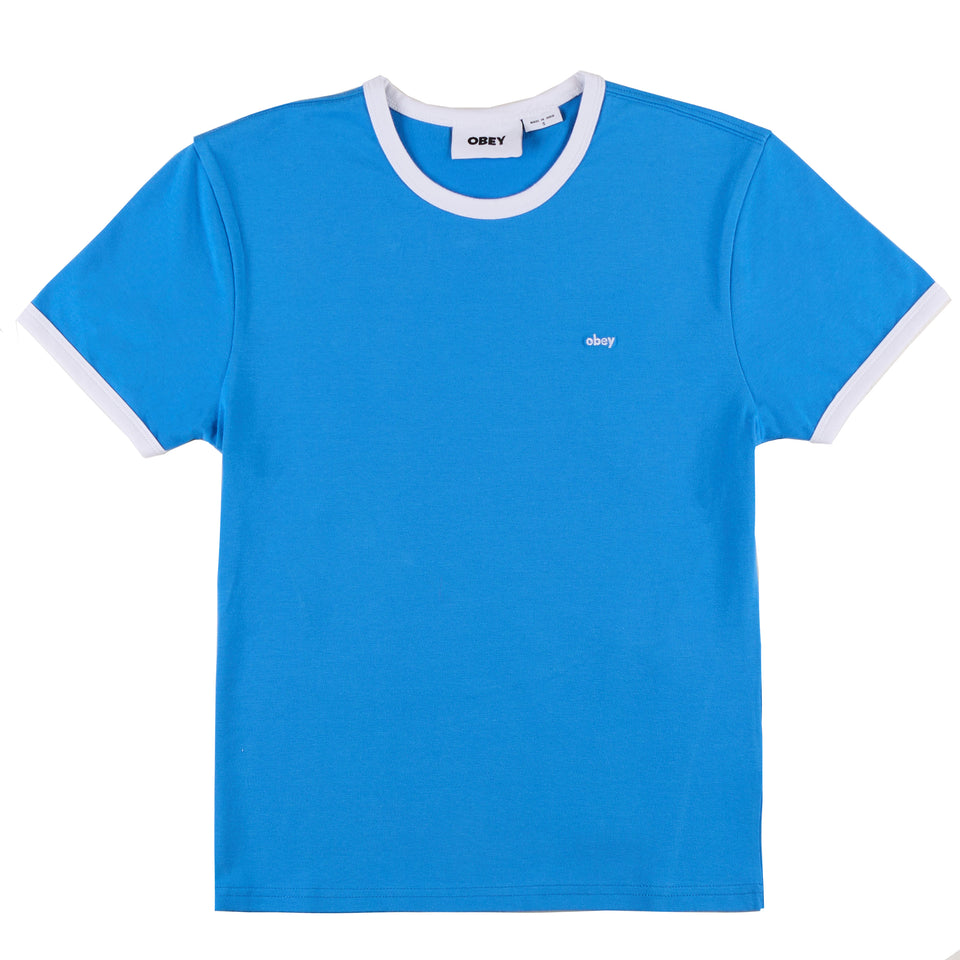 The Obey Women's Tyler Ringer Short Sleeve T-Shirt in Blue features a fitted design with a ribbed neckband and sleeve hems. Made from a cotton-spandex blend, it includes Obey embroidery at the chest and is Fair Trade certified. A stylish, comfortable choice for casual wear with a focus on sustainability.