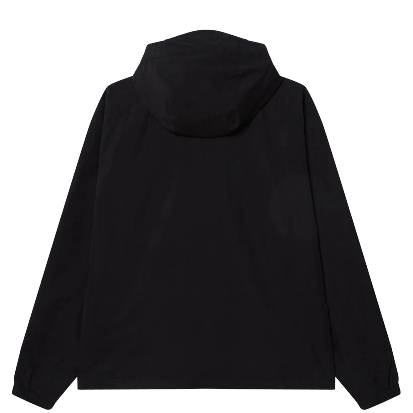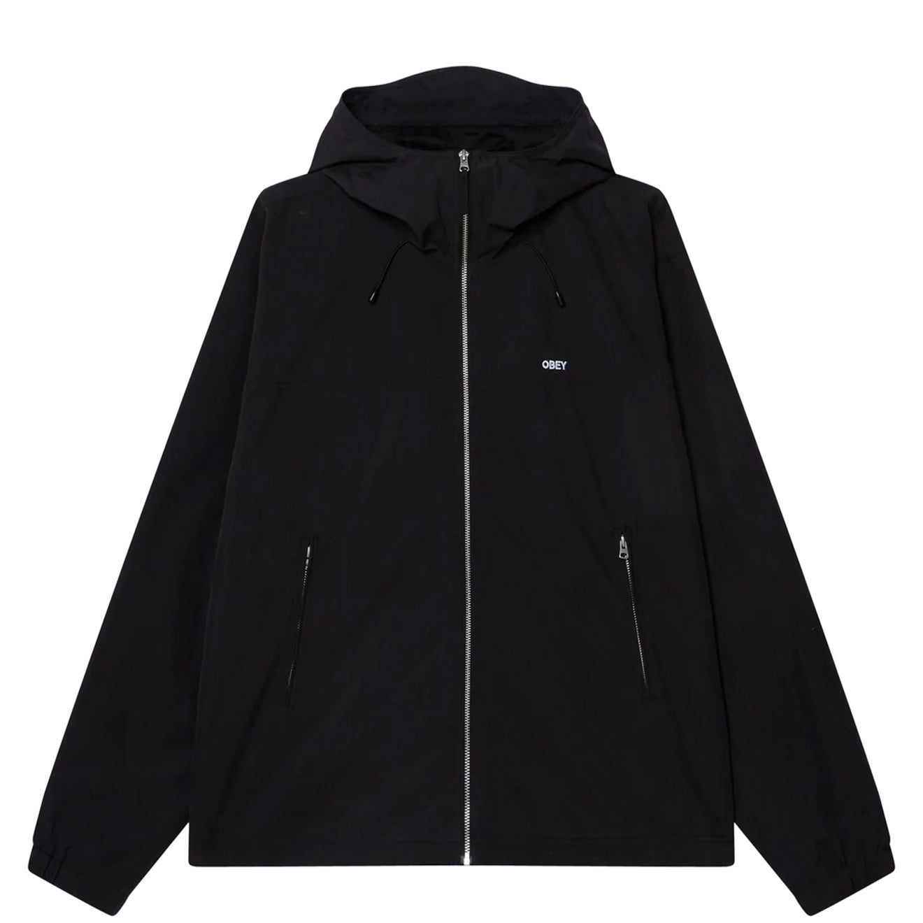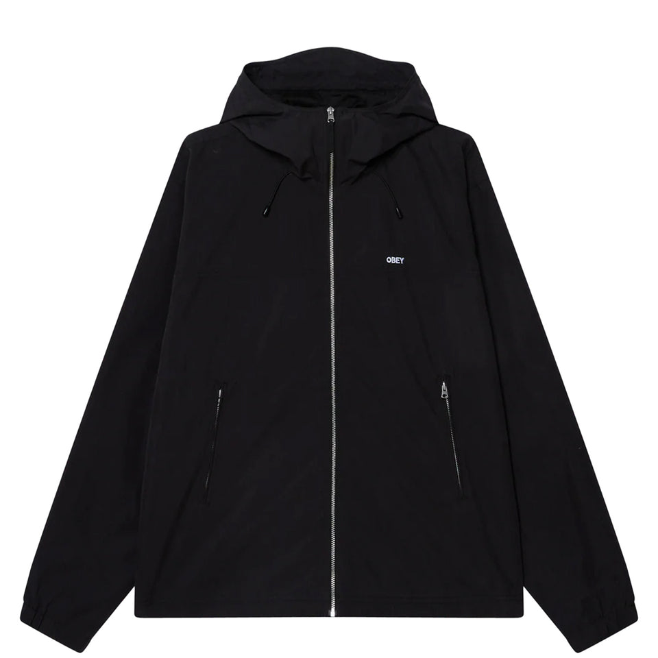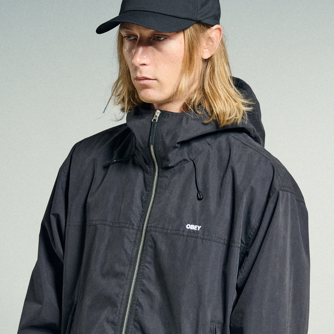 The Obey Vista Jacket in Black is a relaxed fit outer layer made from a water-resistant cotton-nylon shell with full lining. It features a two-way metal zip front closure, a three-piece hood, and adjustable bungee hem for a secure fit. Details include zippered pockets, elasticated cuffs, and embroidered Obey logo branding, offering both function and style.
