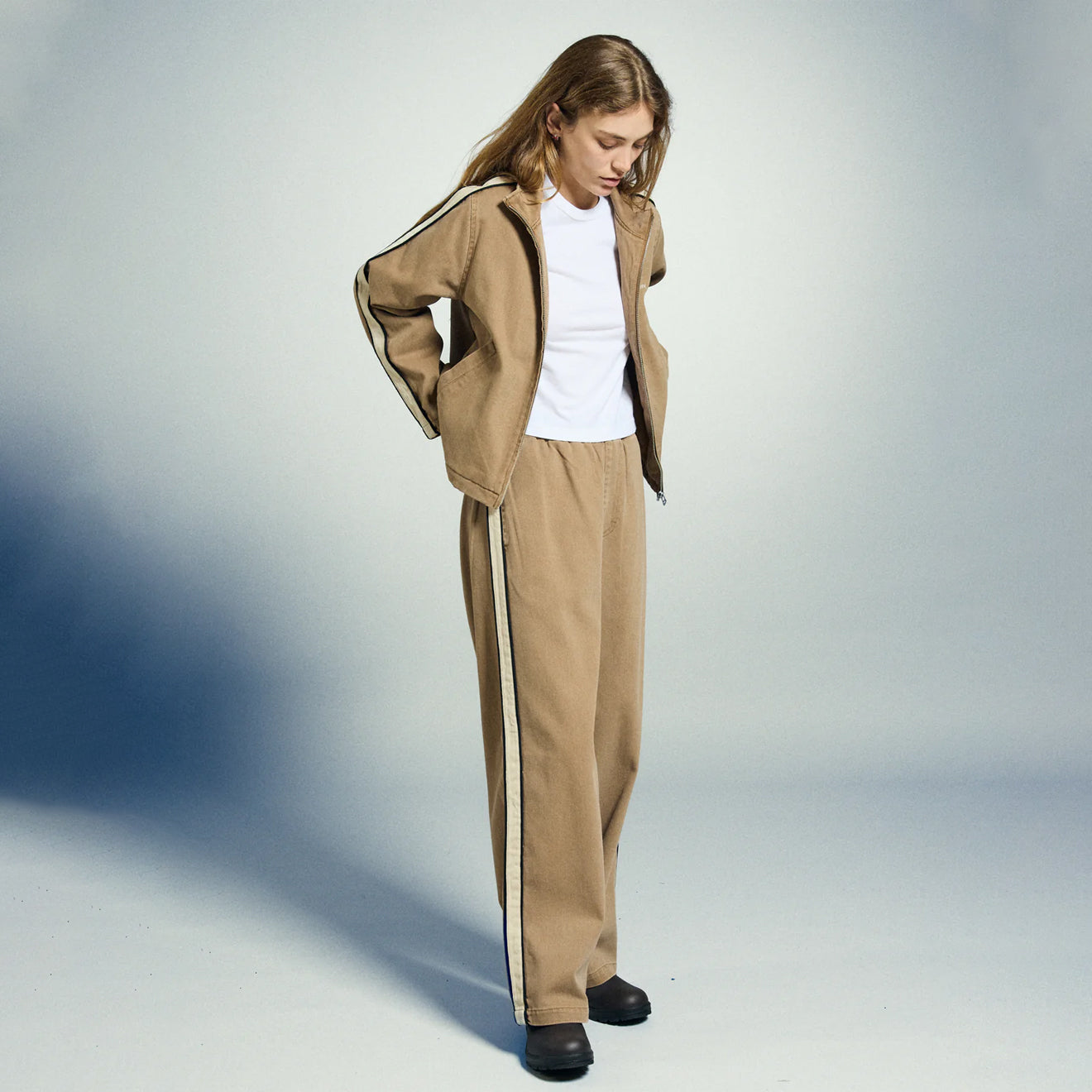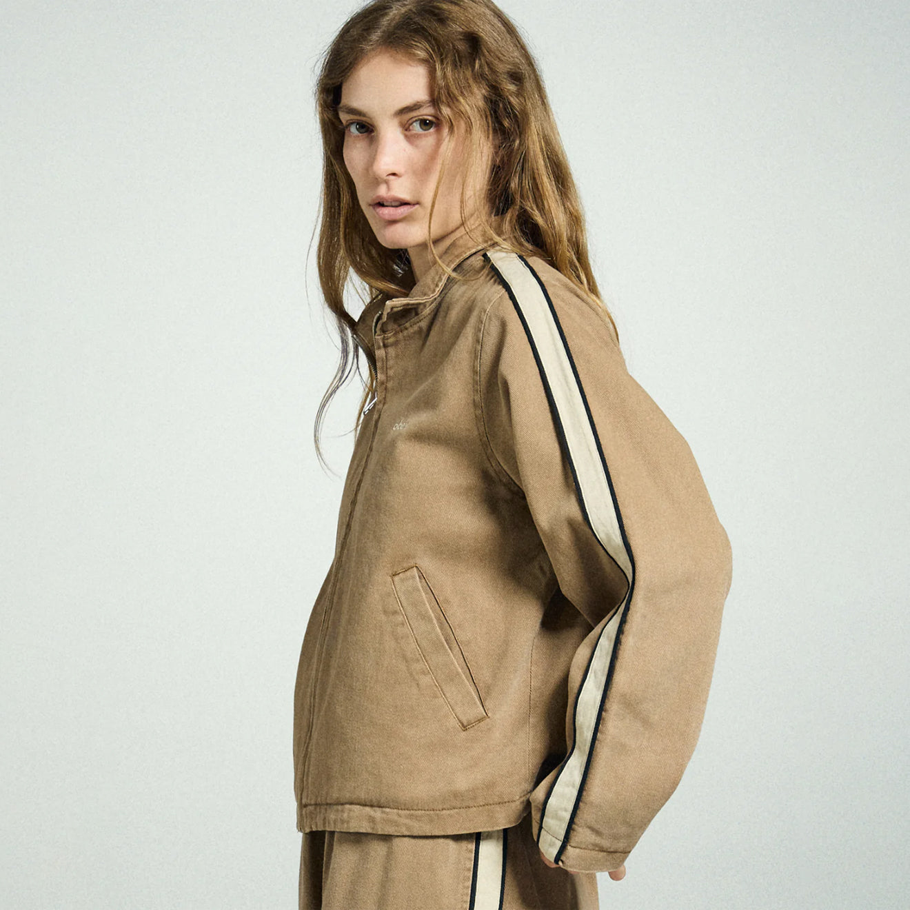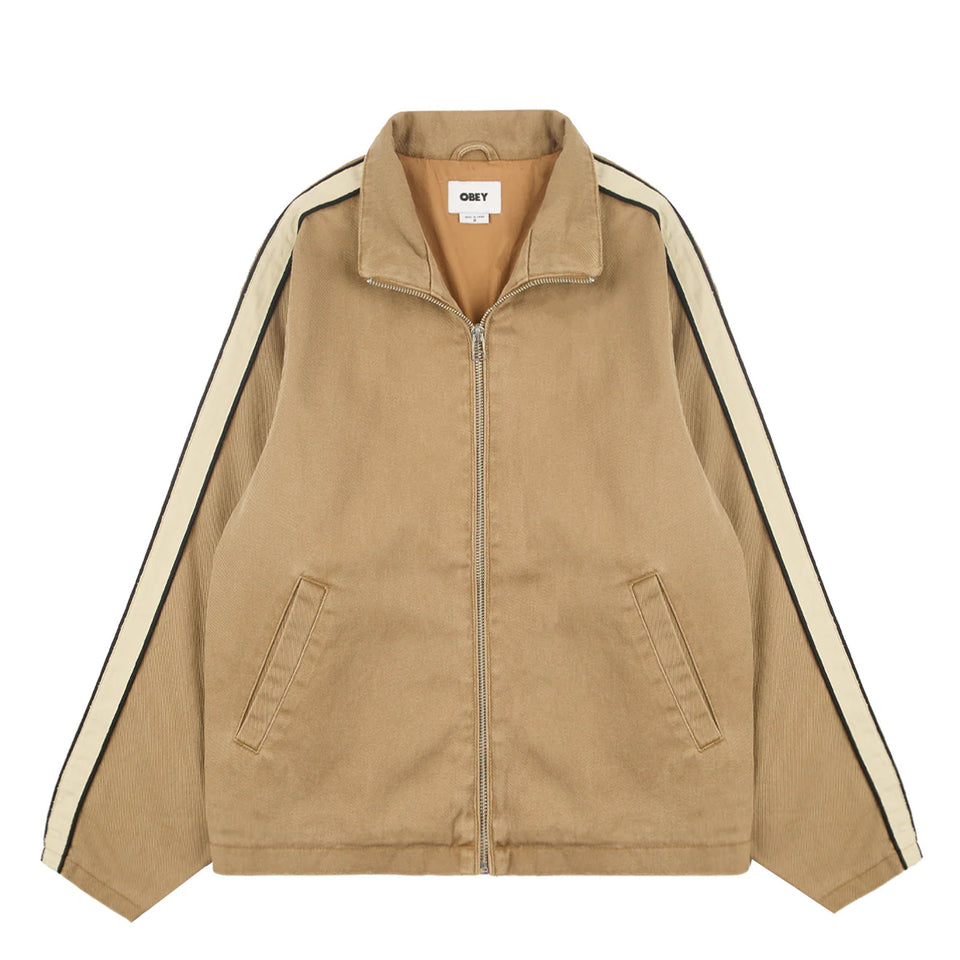 The Obey Womens Astrid Stripe Jacket in Tan Faded Wash is a regular-fit denim jacket made from 13.5oz 100% cotton. Featuring a faded wash, zipper closure, contrast stripe sleeve panels with piping, and welt pockets, it is fully lined without insulation. Finished with open cuffs and hem and Obey chest embroidery, this jacket blends classic denim style with subtle sporty details.