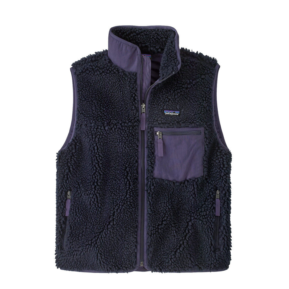 The Patagonia Womens Classic Retro-X Fleece Vest in Sunken Blue combines timeless style with sustainable materials. Crafted from 100% Repreve® recycled polyester fleece and lined with durable water-repellent taffeta, this vest offers windproof warmth, practical pockets, and a fleece-lined collar. Perfect for layering over casual or outdoor outfits, it maintains the heritage look with modern functionality.
