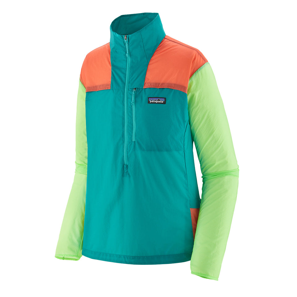 The Patagonia Women's Houdini Stash 1/2-Zip Pullover in Subtidal Blue is a lightweight, packable layer, with weather resistant properties whilst you are on the go. Fitting right into it's own pocket, three vents for a comfortable wear, and a half zip closure, this is the perfect companion on your travels.