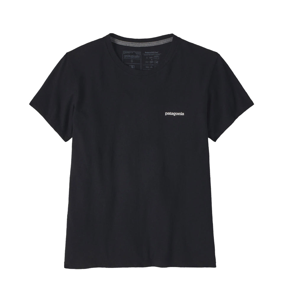 The Patagonia Womens P-6 Logo Responsibili-Tee in Black is a classic everyday T-shirt made with sustainability in mind. Crafted from a soft blend of recycled cotton and postconsumer recycled polyester, it delivers lasting comfort while reducing the use of new raw materials.