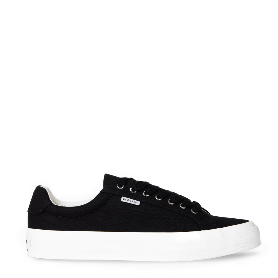 The Paul Smith Amos Canvas Trainers in Black feature 100% cotton canvas uppers paired with classic vulcanised white rubber soles and tonal laces. A PS Paul Smith logo tab on the side offers subtle branding, while the 'Sports Stripe' detail on the insole adds a signature pop of colour.