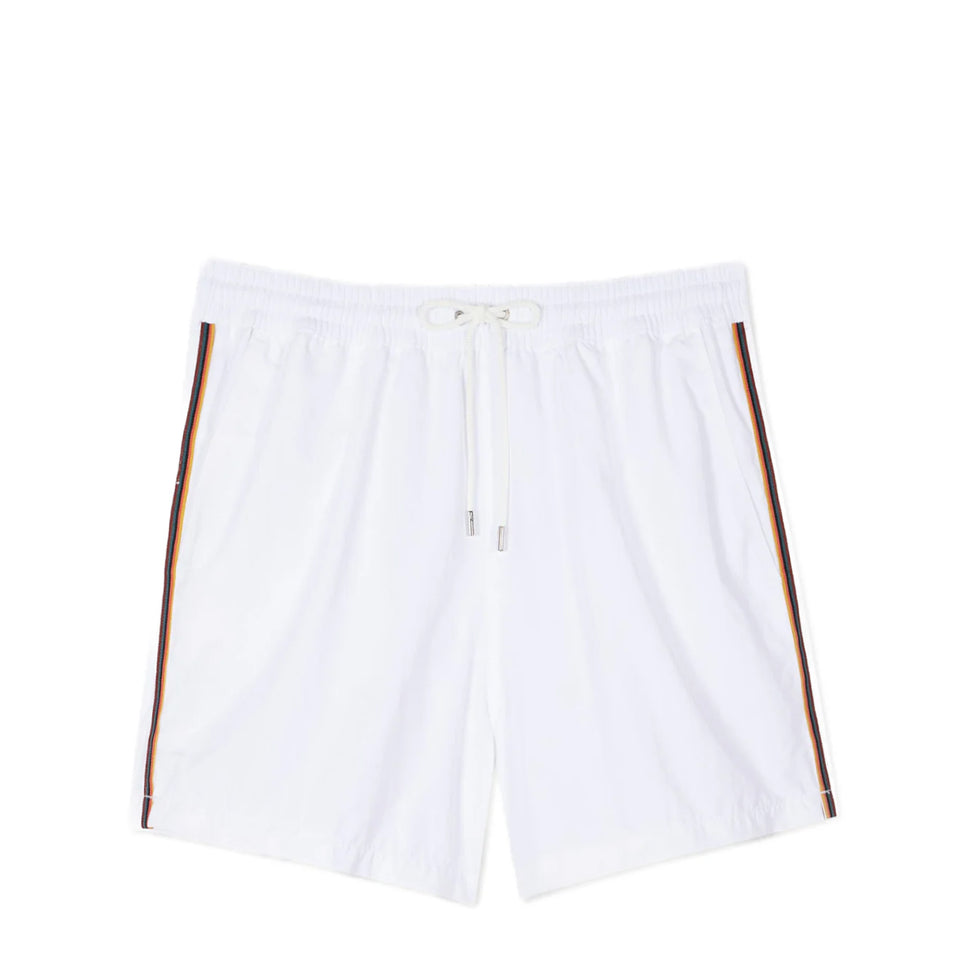 The Paul Smith Artist Stripe Swim Shorts in White feature a classic fit and are accented with 'Artist Stripe' grosgrain trim on both sides. Made from fast-drying fabric crafted using recycled materials, these shorts offer a blend of sustainable design and signature Paul Smith style—ideal for poolside or beachwear.