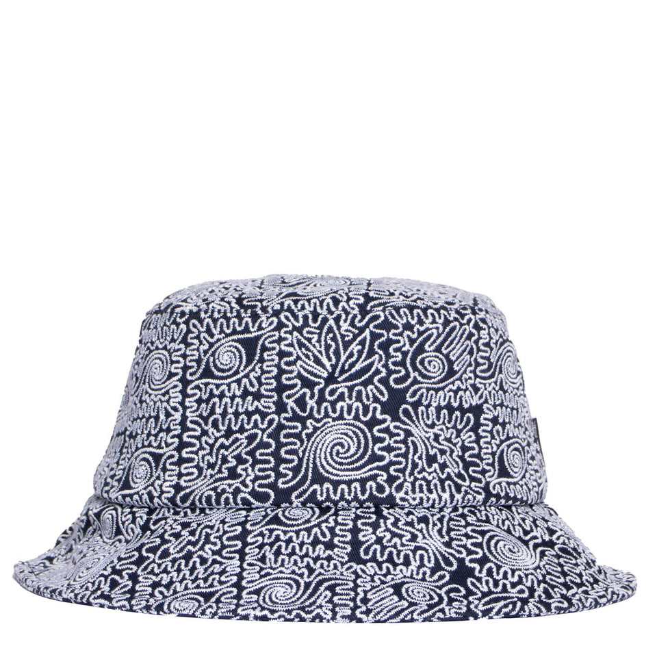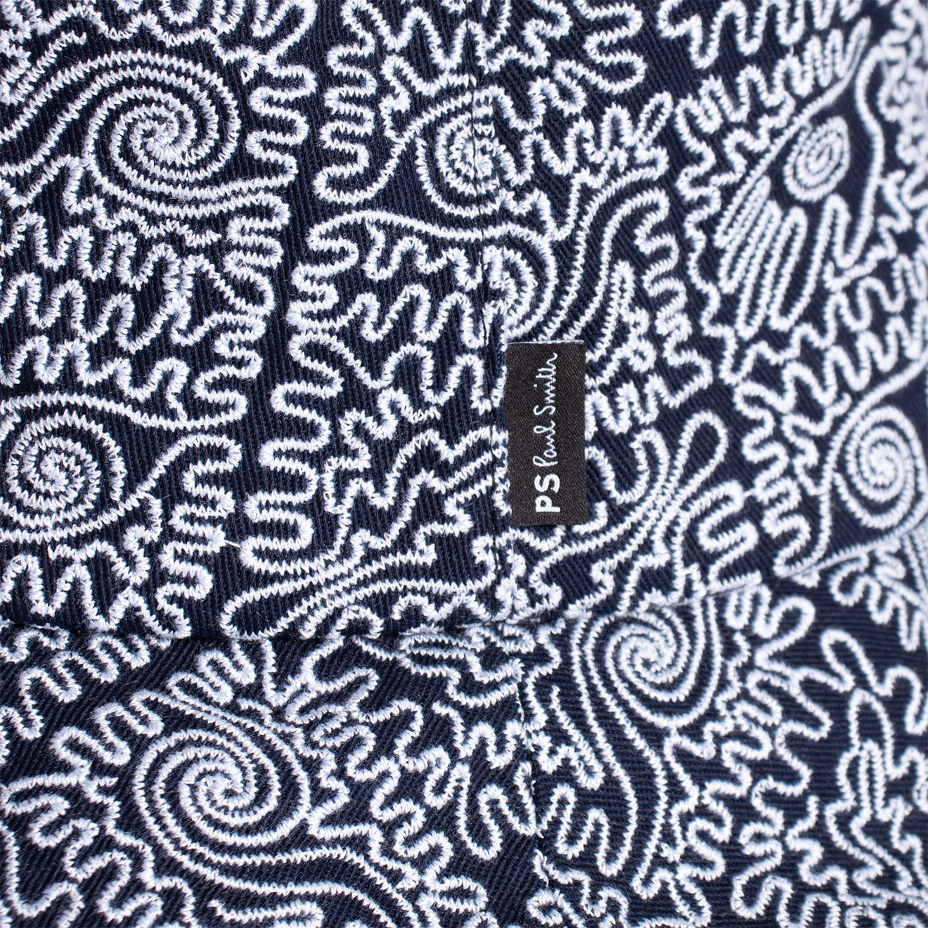 The Paul Smith Bucket Hat Arabi Emb in Navy is made from 100% cotton, showcasing a navy 'Punta Arabi' pattern and is finished with the trademark black 'PS Paul Smith' logo tab on the front.