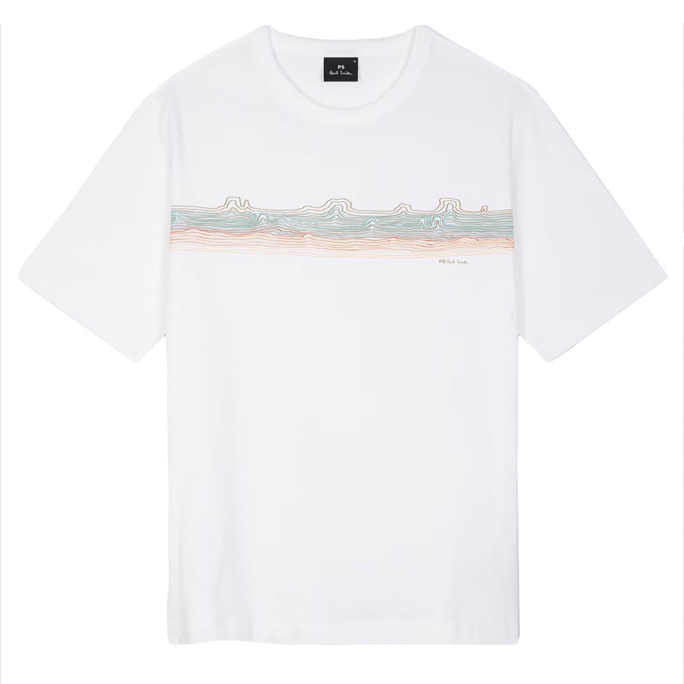 The Paul Smith Desert Stripe Print T-Shirt in white is made from 100% organic cotton for a soft, breathable feel. Featuring a bold 'Desert Stripe' graphic across the chest, this regular-fit tee adds a modern edge to any casual wardrobe.