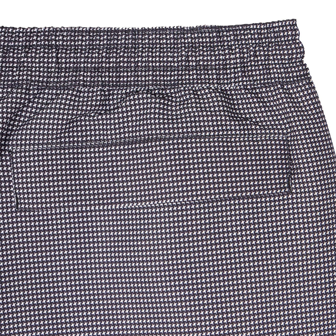 The Paul Smith Houndstooth Swim Shorts in Black are crafted from recycled polyester and showcase a classic monochrome houndstooth print. These swim shorts feature an elasticated waistband, a zipped coin pocket, twin front and back pockets, and a breathable mesh lining for enhanced comfort. Perfect for stylish and sustainable swimwear.