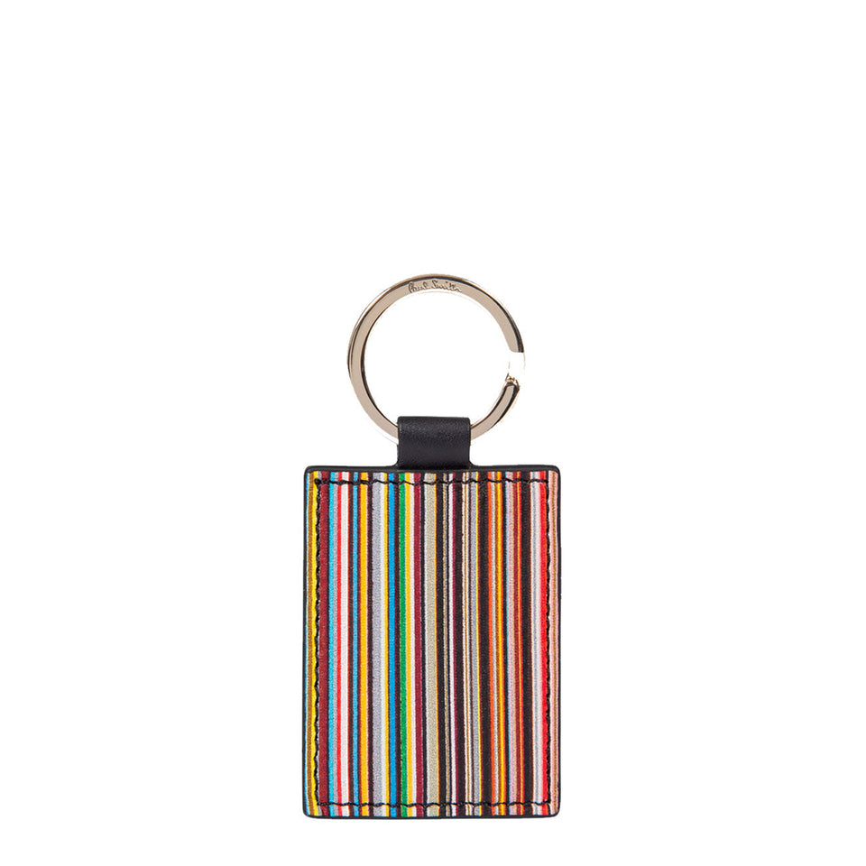 Signature stripe calf leather keyring with Paul Smith signature embossed steel hardware. Finished with a gold foil Paul Smith signature on the back, this keyring is presented in a black gift-pouch.