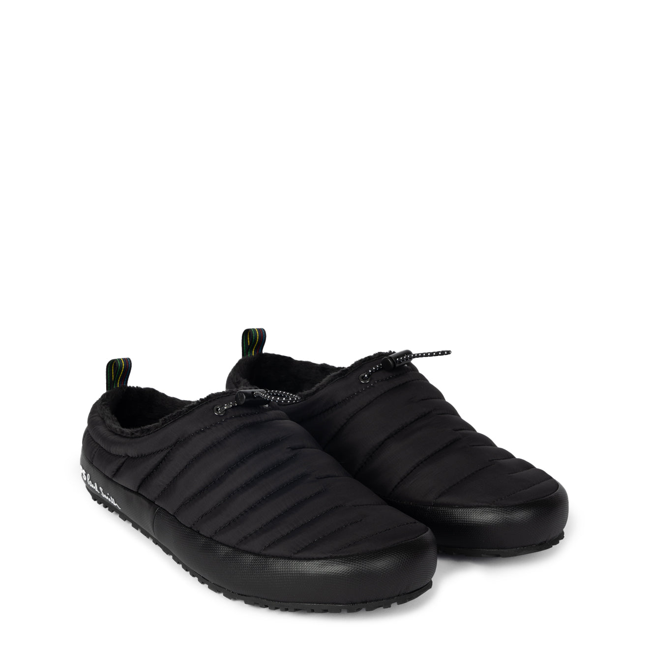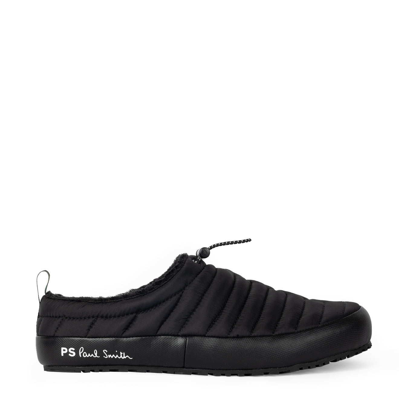 The Paul Smith Larsen Slipper in Black is crafted from a lightweight nylon upper, showcasing a minimalist design that emphasizes comfort and style. With a plush lining for added warmth, these mule slippers feature a black rubber outsole for optimal grip and stability. The toggle adjustable drawcord allows for a customized fit, making them perfect for lounging at home while combining practicality with a sleek aesthetic.