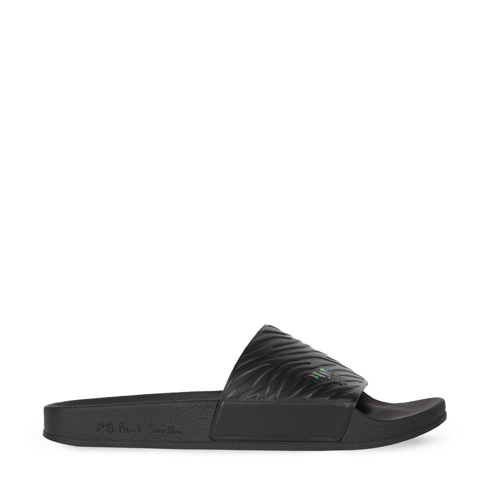 The Paul Smith Zed Slides in Black are crafted from lightweight rubber, featuring an embossed textured zebra stripe strap for a stylish edge. Bold 'Zebra' branding adds vibrant flair, making these slides perfect for casual, everyday wear with a distinctive look.