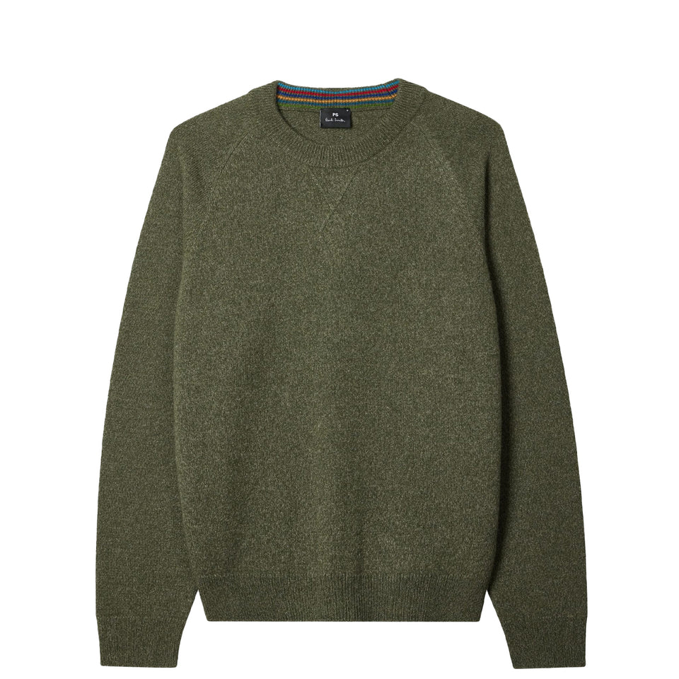 The Paul Smith Merino Wool Sweater in Green is crafted in Portugal from 100% merino wool. This regular-fit crew neck sweater features a raglan sleeve design and a vintage sportswear-inspired 'V' stitch at the collar, combining classic style with subtle detailing.