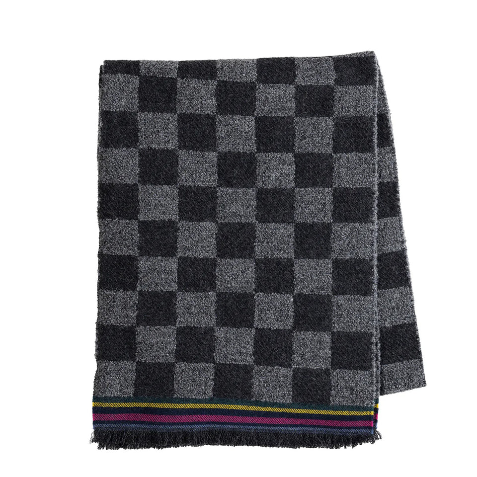 The Paul Smith PS Scarf in Checkerboard in Black, made in Italy from a wool blend, features a stylish two-texture 'Checkerboard' design throughout. It is finished with short tassels at each end, highlighted by a contrasting stripe in yellow, pink, and blue. This scarf is a perfect blend of warmth and contemporary style.