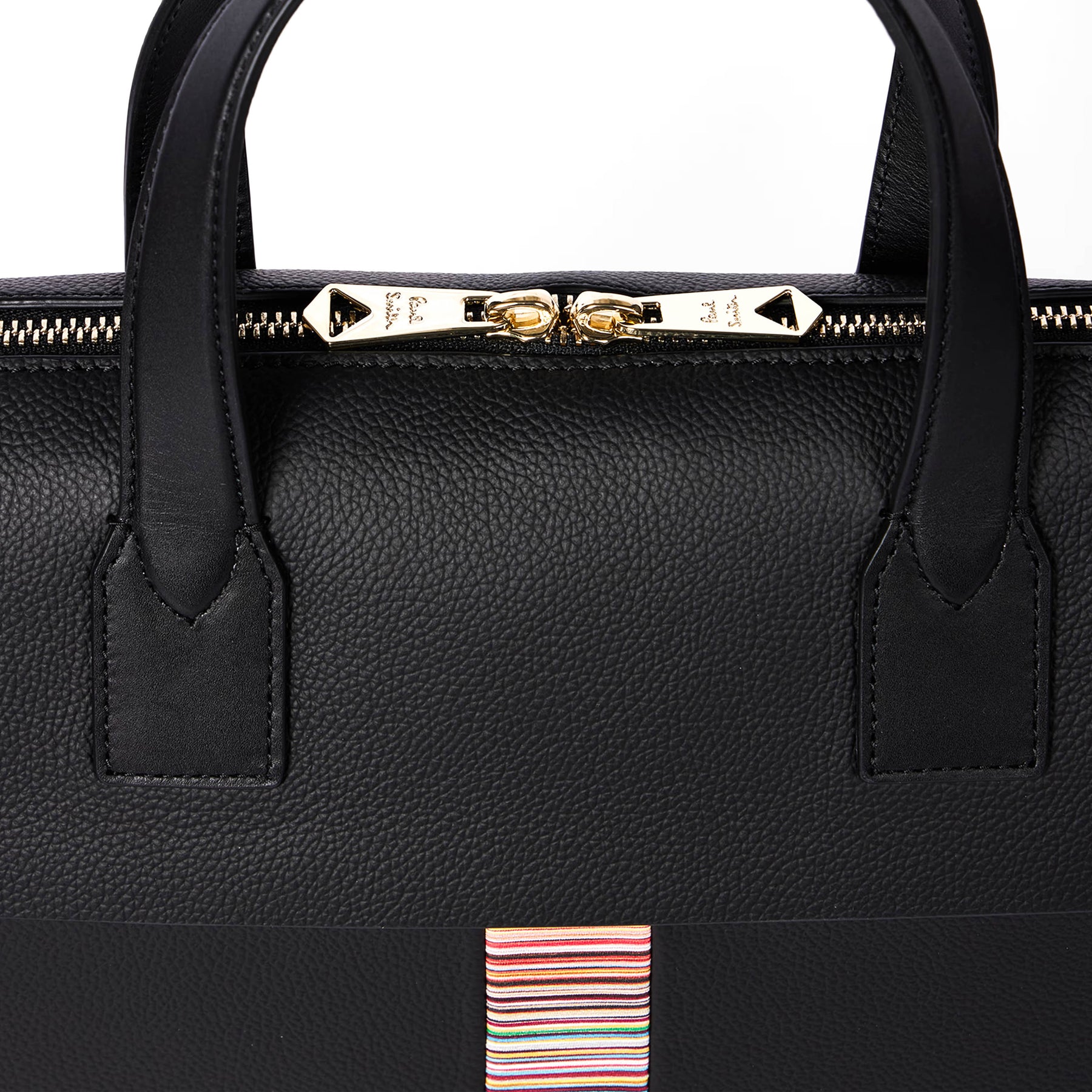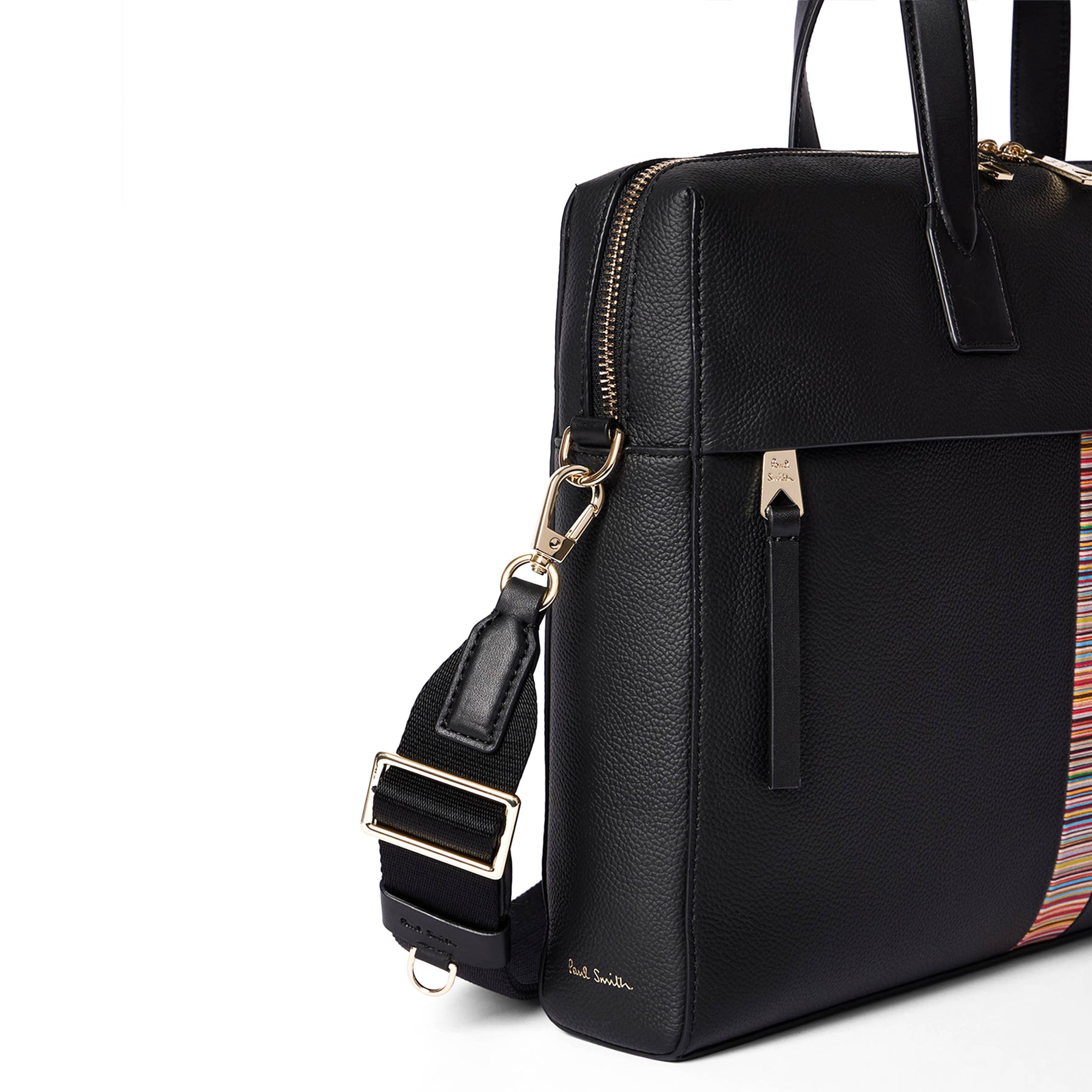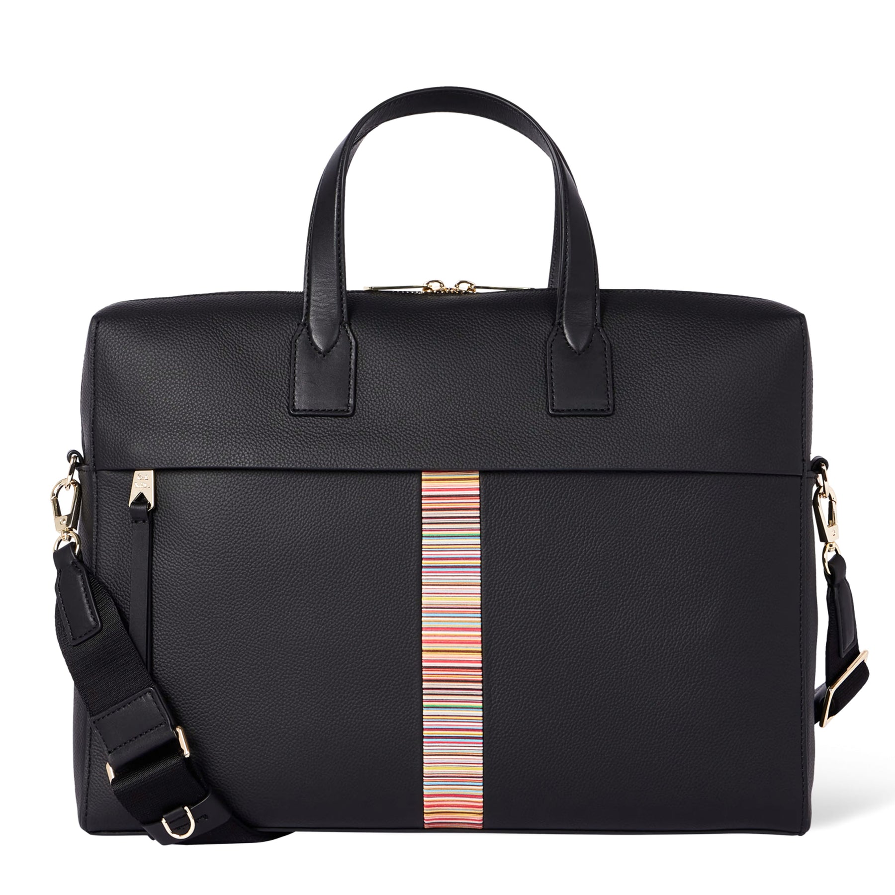 The Paul Smith Signature Stripe Folio Bag in Black is crafted from premium grained leather, featuring the iconic 'Signature Stripe' trim down the centre for a refined and timeless look. Designed in a sleek business folio style, this bag offers a two-way zip opening, a fully lined interior, and a detachable shoulder strap for versatile carrying options. Ideal for daily commutes or professional settings, the Paul Smith Signature Stripe Folio Bag combines sophistication with practicality.