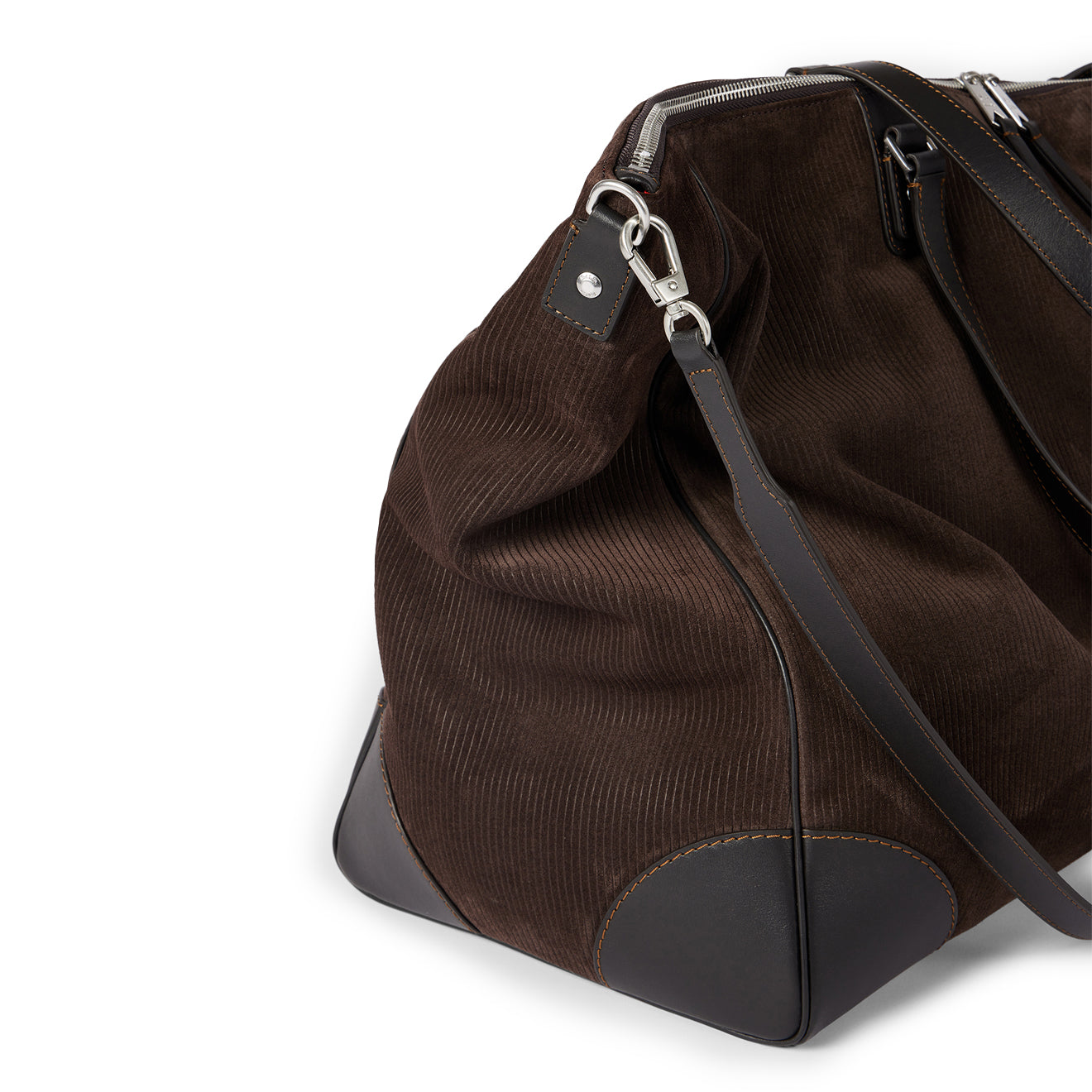 the Paul Smith Suede Duffle Holdall in brown features supple suede with leather accents, a spacious interior, and multiple strap options for a functional and stylish travel bag.