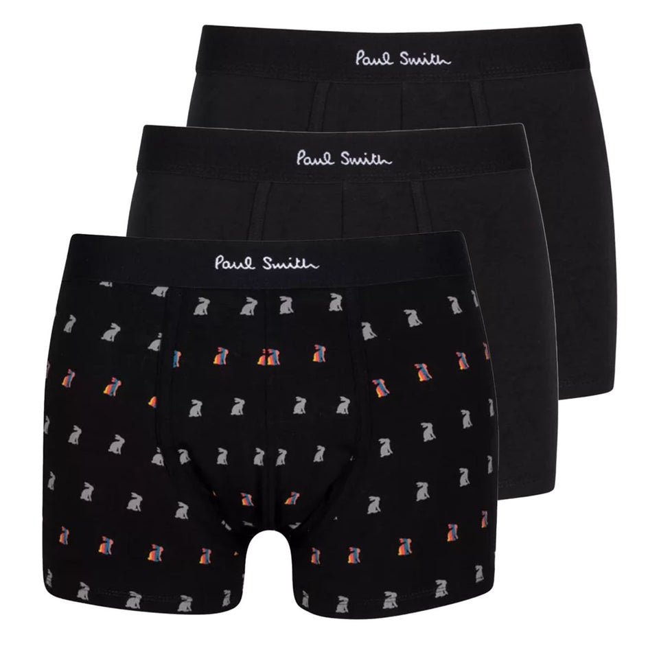 Paul Smith Trunk 3 Pack Modal in Rabbit Black. This three pack contains boxer briefs in black and rabbit print. Made from a soft and breathable modal, these boxer shorts feature a large tonal Paul Smith signature on the elasticated waistband.