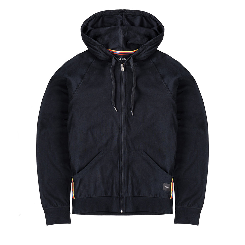 This Paul Smith Zip Lounge Hoodie Black is crafted from lightweight cotton jersey for a relaxed, comfortable fit. The zip-front design comes with a playful colourful zip tape plus a tie-shaped zip pull. Raglan sleeves, front pouch pockets, and a Paul Smith logo patch complete the look.