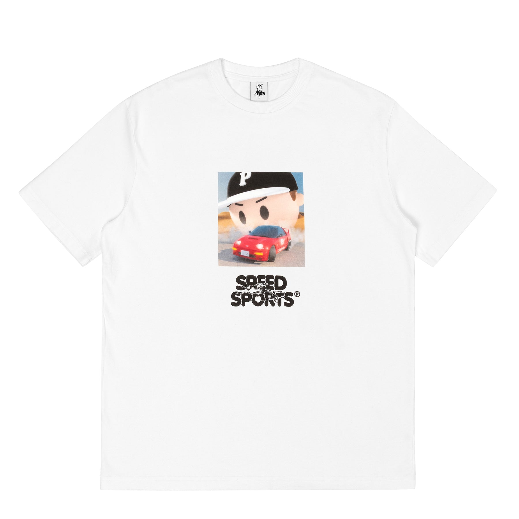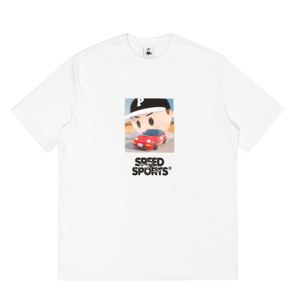 The Pawa Speed Sports Desert Drift T-Shirt in white features a digital print designed by PAWA, pairing the 'SPEED SPORTS' logo with a drifting-inspired graphic. Made from 230GSM cotton, this tee is durable and versatile, perfect for wearing solo or layered under a jacket.