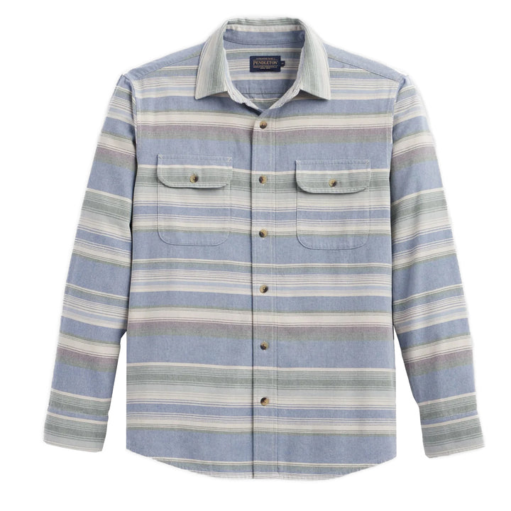 The Pendleton Beach Shack Shirt in Navy Stripe is a timeless casual essential, crafted from soft washed cotton for a vintage feel. Featuring classic Pendleton stripes, metal buttons, button-through flap chest pockets, and a shirttail hem, this versatile shirt offers all-season comfort and relaxed style.