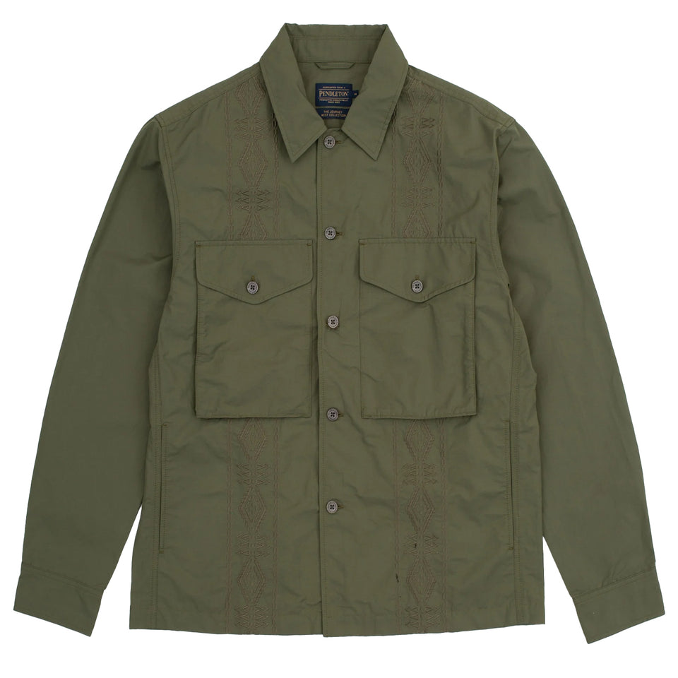 The Pendleton Parachute Overshirt in Olive is a modern reinterpretation of the classic military overshirt, part of the exclusive European Journey West collection inspired by Pendleton founder Thomas Kay. Made from durable nylon semi-ripstop fabric, it offers a lightweight technical feel. Subtle tonal Pendleton needlework embroidery adds refined detail, blending heritage craftsmanship with contemporary style. Perfect for versatile layering with a timeless edge.