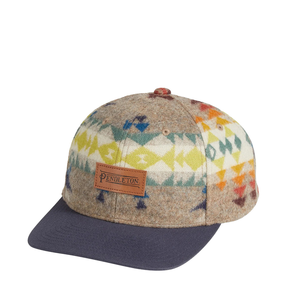 Pendleton Pendleton Wool Hat Highland Peak in Tan. A six-panel hat crafted from pure virgin wool jacquard. Medium curved brim, adjustable snap-back closure, leather logo patch. Pattern placement may vary.