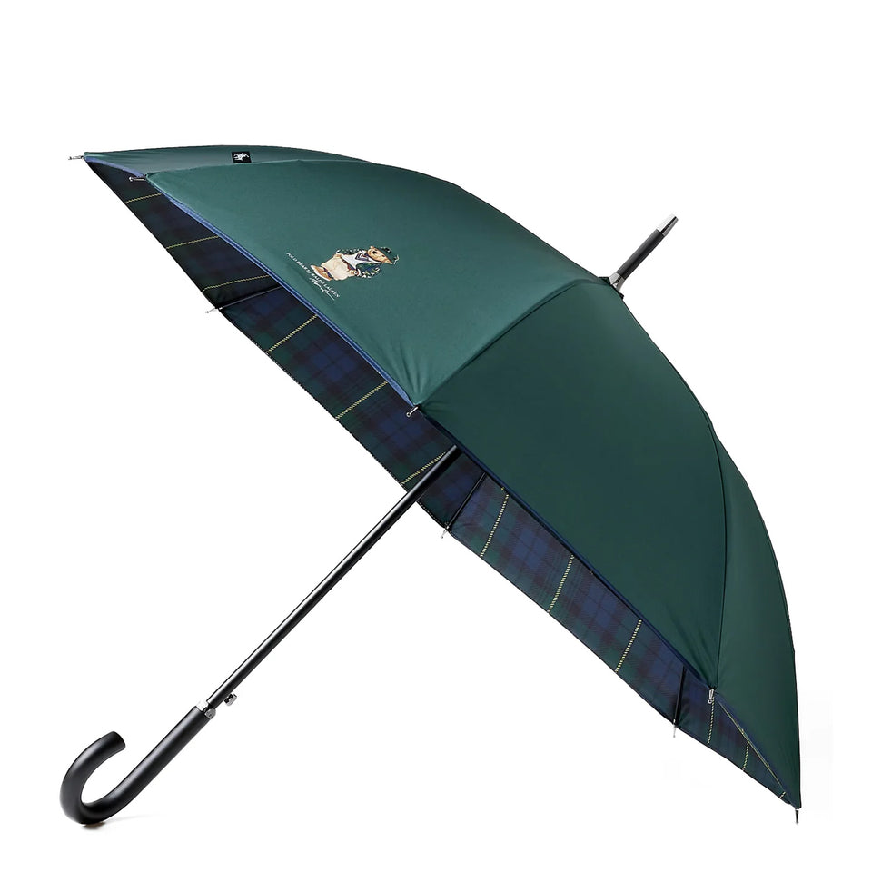 The Polo Ralph Lauren Highmoore Polo Bear Umbrella features the iconic Polo Bear on the exterior canopy and a refined tartan-inspired pattern on the interior, creating a distinctive and stylish look for rainy days.