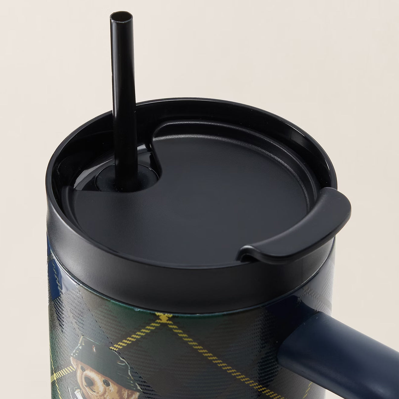 The Polo Ralph Lauren Highmoore Polo Bear Water Bottle & Straw is a 900 ml stainless steel bottle designed for on-the-go use. It includes a handle, a secure lid, and a silicone straw for easy sipping. Featuring the iconic Polo Bear and signature branding on a tartan-inspired plaid, it merges functionality with classic Ralph Lauren style.
