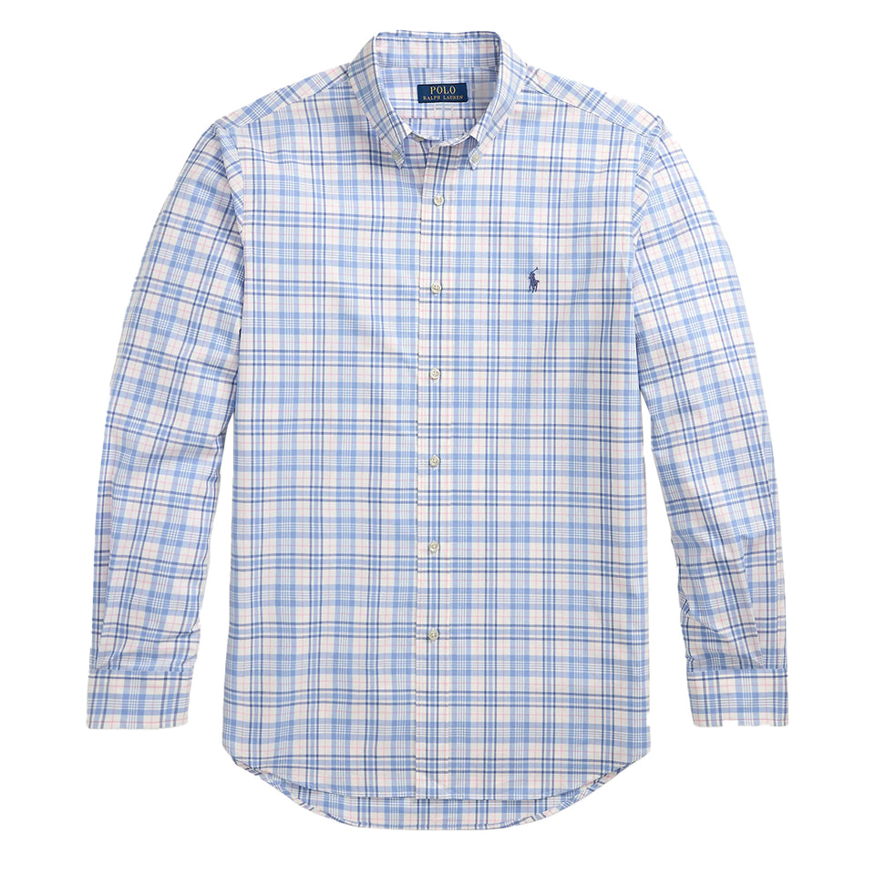 The Polo Ralph Lauren Long Sleeve Sport Shirt in Custom Blue Pink Multi is made from soft cotton with a subtle check pattern in light blue and pink. It features a classic collar, button closure, and button cuffs, with the signature embroidered logo on the chest. Finished with a curved hem, this shirt offers a regular fit suitable for both casual and smart-casual styling.