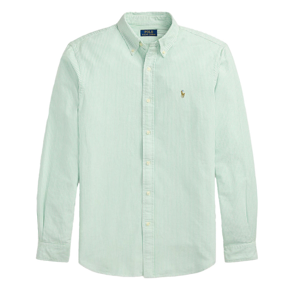 The Polo Ralph Lauren Long Sleeve Sport Shirt Custom Fit in Summer Emerald / White is crafted from 100% cotton with a trim silhouette that sits between classic and slim fits. Featuring a button-down collar, long sleeves with buttoned cuffs, and a split back yoke with box pleat, it offers comfort and range of motion. The multicoloured embroidered Pony on the chest adds a signature Ralph Lauren detail.