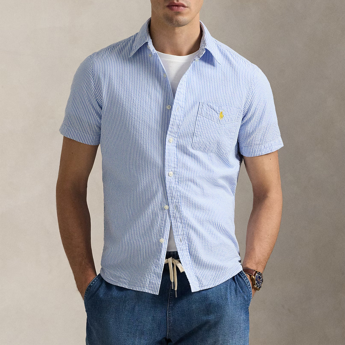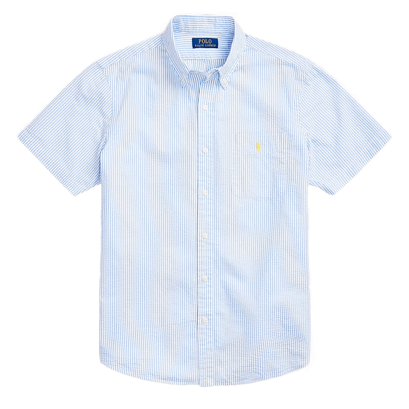 The Polo Ralph Lauren Short Sleeve Sport Shirt in Custom Blue and White combines casual comfort with refined detailing. Made from soft cotton, it features a white striped design, a chest pocket, and a button-down collar for a versatile, classic style.