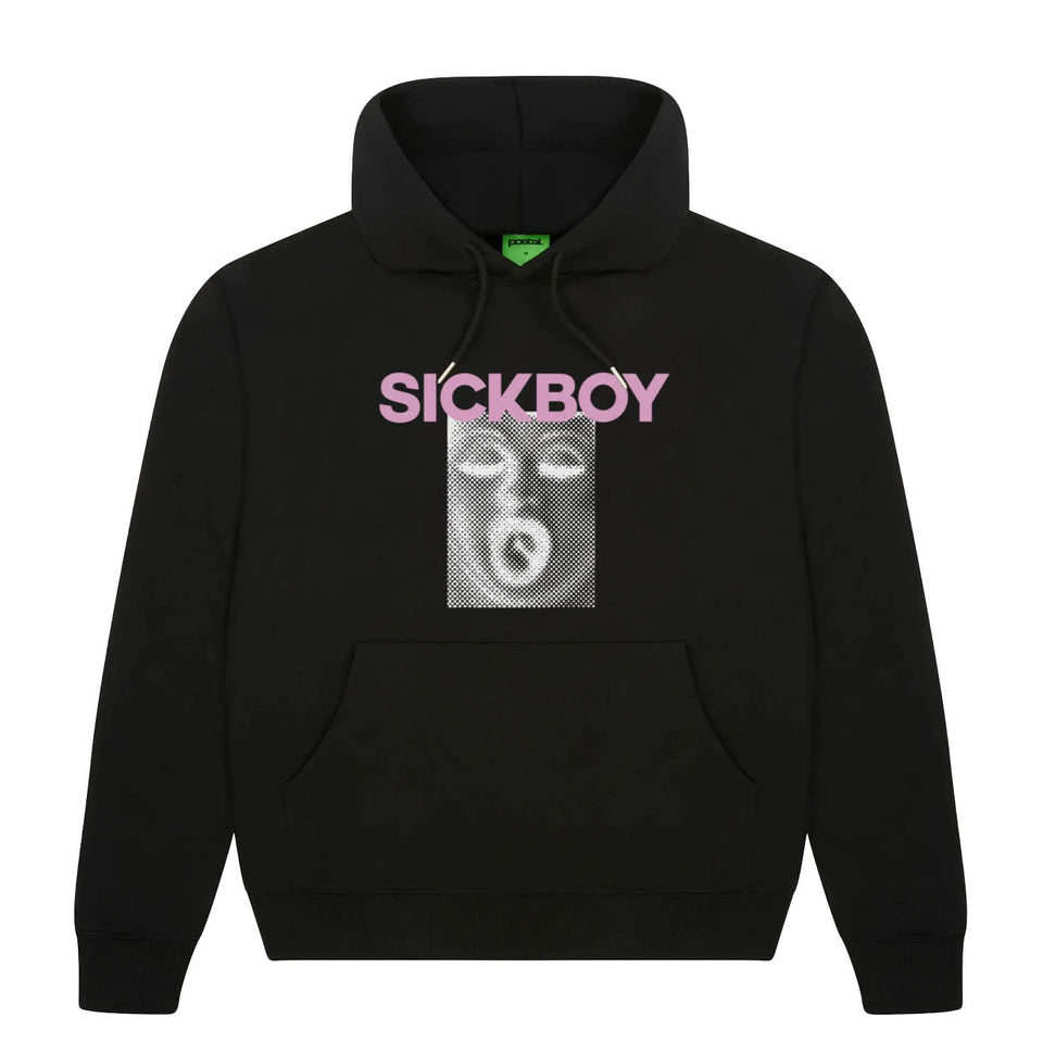 The Postal Sickboy Print Hood in Black is a weighted hoodie made from 100% Cotton. It features the POSTAL 'Sickboy' graphic on the front and has an adjustable hood with ribbed hems and cuffs for a custom fit.