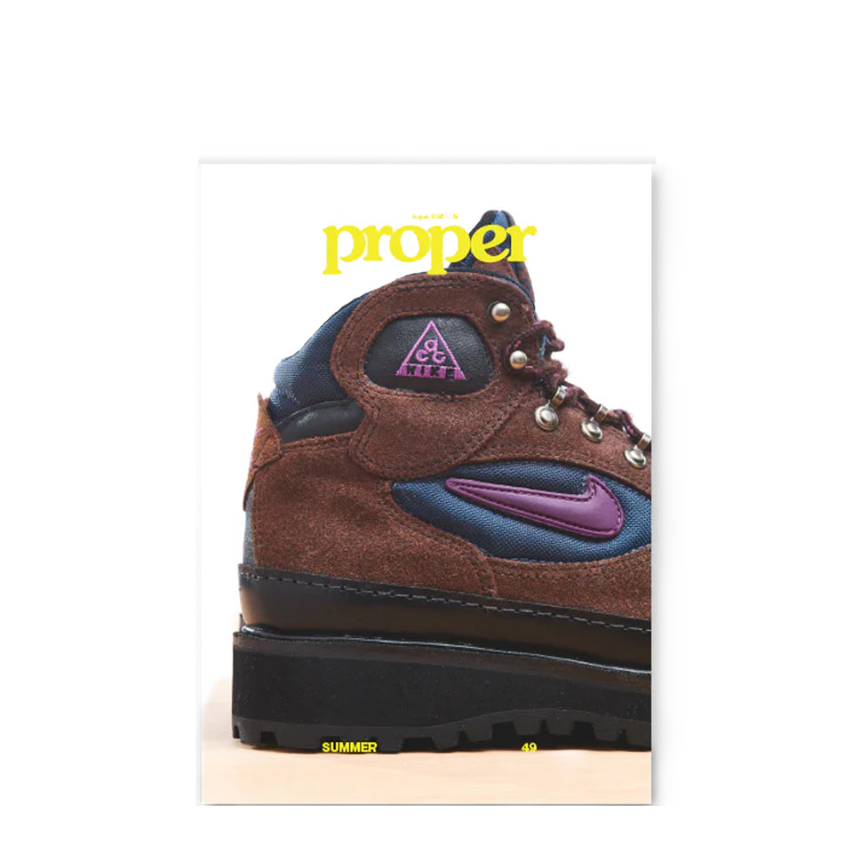 The Proper Magazine Issue 49 explores the intersection of clothing, culture, and the outdoors. This slightly larger edition covers trail running, outdoor gear, fishing, and interviews with Lorenzo Osti, Tom Aspinall, and Nike ACG pioneers.