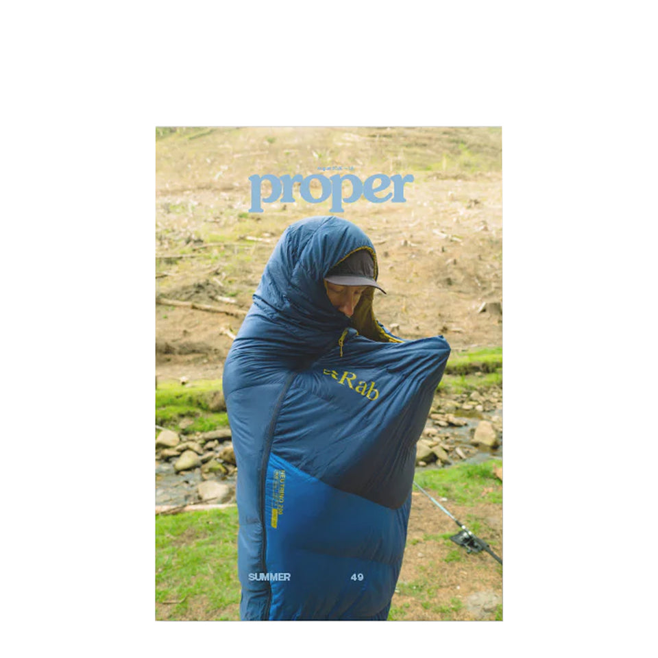 The Proper Magazine Issue 49 explores the intersection of clothing, culture, and the outdoors. This slightly larger edition covers trail running, outdoor gear, fishing, and interviews with Lorenzo Osti, Tom Aspinall, and Nike ACG pioneers.