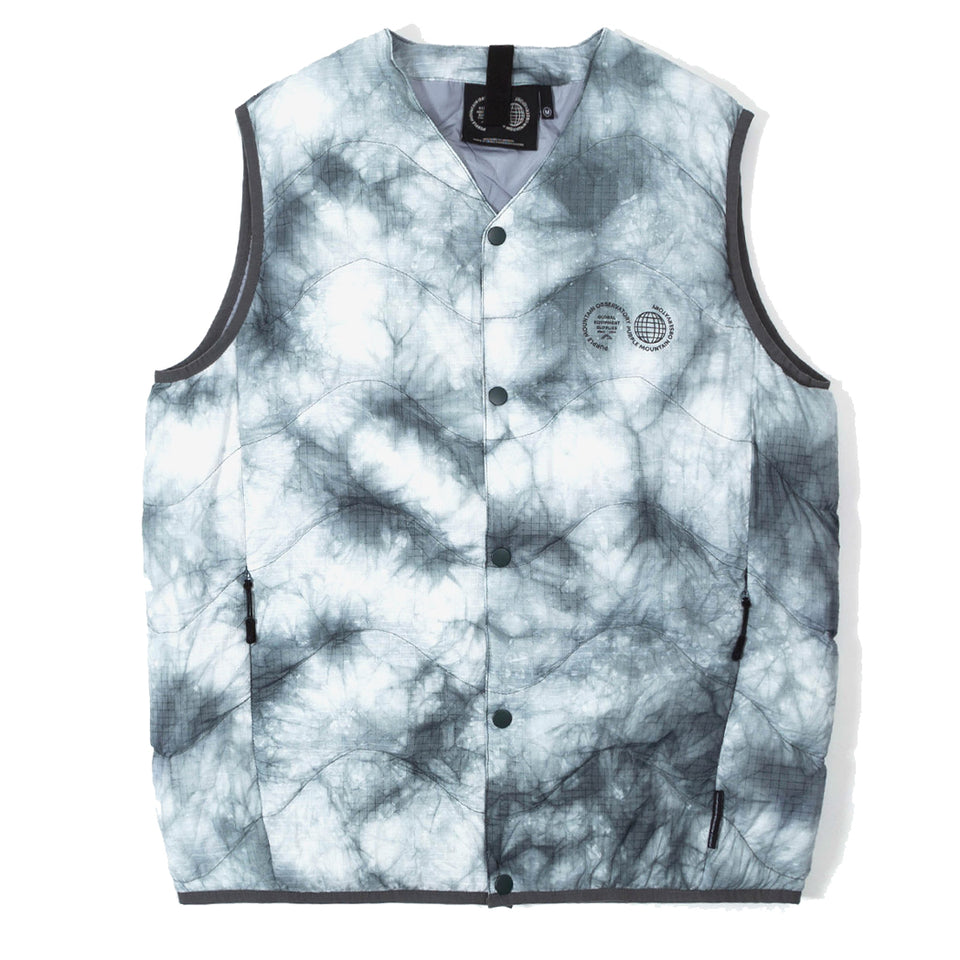 The Quilted Vest is an extremely lightweight, high loft style. The hand Ice Dye'd mini ripstop fabric has DWR and anti-static treatments.