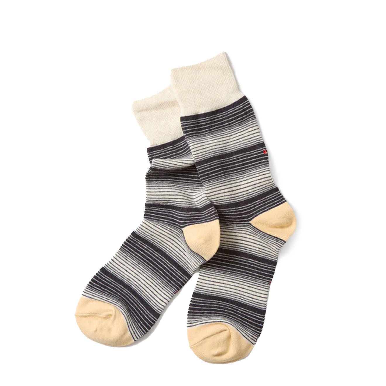 The RoToTo Multi Stripe Socks in Charcoal draw inspiration from the striped tees of the early 1990s. Each sock is knitted with Raffy yarn, a unique blend of long staple cotton and cotton waste. The yarn is slowly spun in Japanese factories using a traditional method that has been unchanged for over 50 years, ensuring a distinctive texture. These socks combine nostalgic style with comfort and quality.