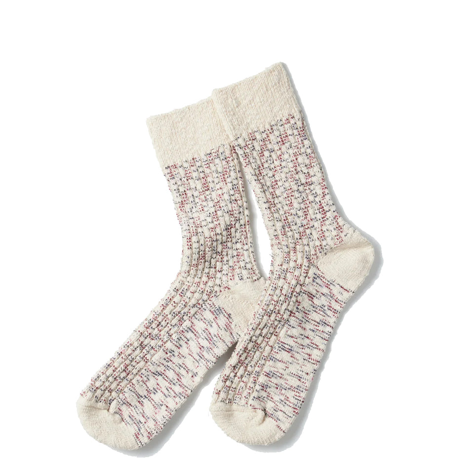 These ribbed socks are knitted with a mix of multi-color ‘Kasuri’ dyed yarn and ROTOTO’s exclusive organic cotton slub yarn co-developed with a spinning company. The complex shades of Kasuri dyeing and the uneven surface of slub yarn make each item look unique and distinct. The fabric has just-right thickness for year-round use.