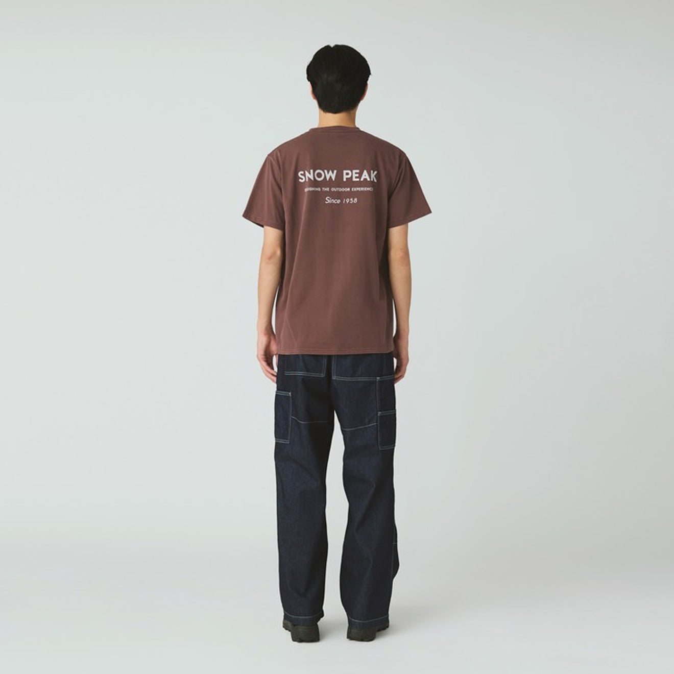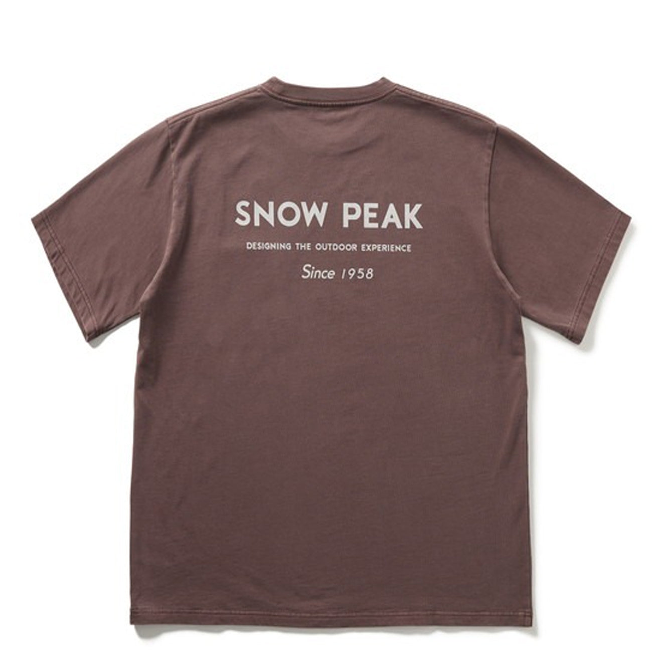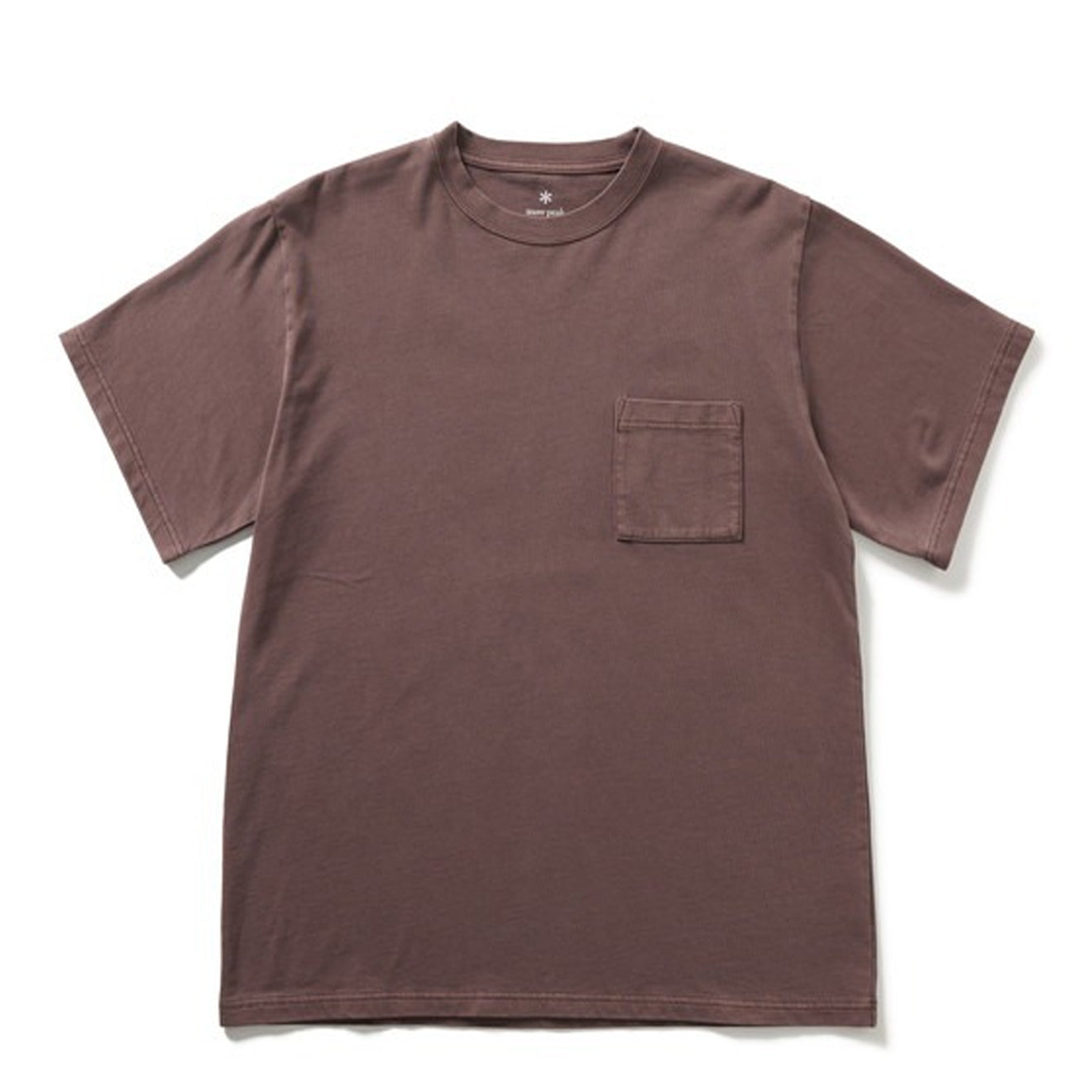 The Snow Peak Garment Dyed T-Shirt in Burgundy features a large printed graphic on the back and a chest patch pocket. Made with pigment-dyed fabric, it develops a slightly aged, vintage look with each wash.